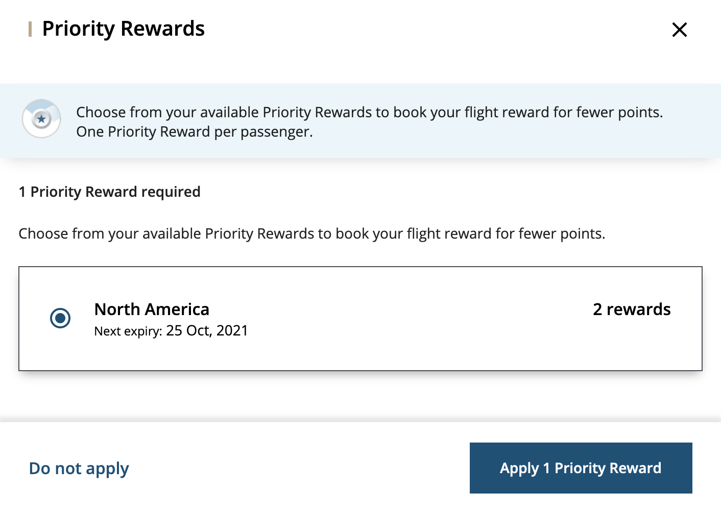 If your Priority Reward is eligible for the route you’re currently searching for, then you can choose to apply it to the search results. The eligible flights will then have their prices instantly reduced by 50%.