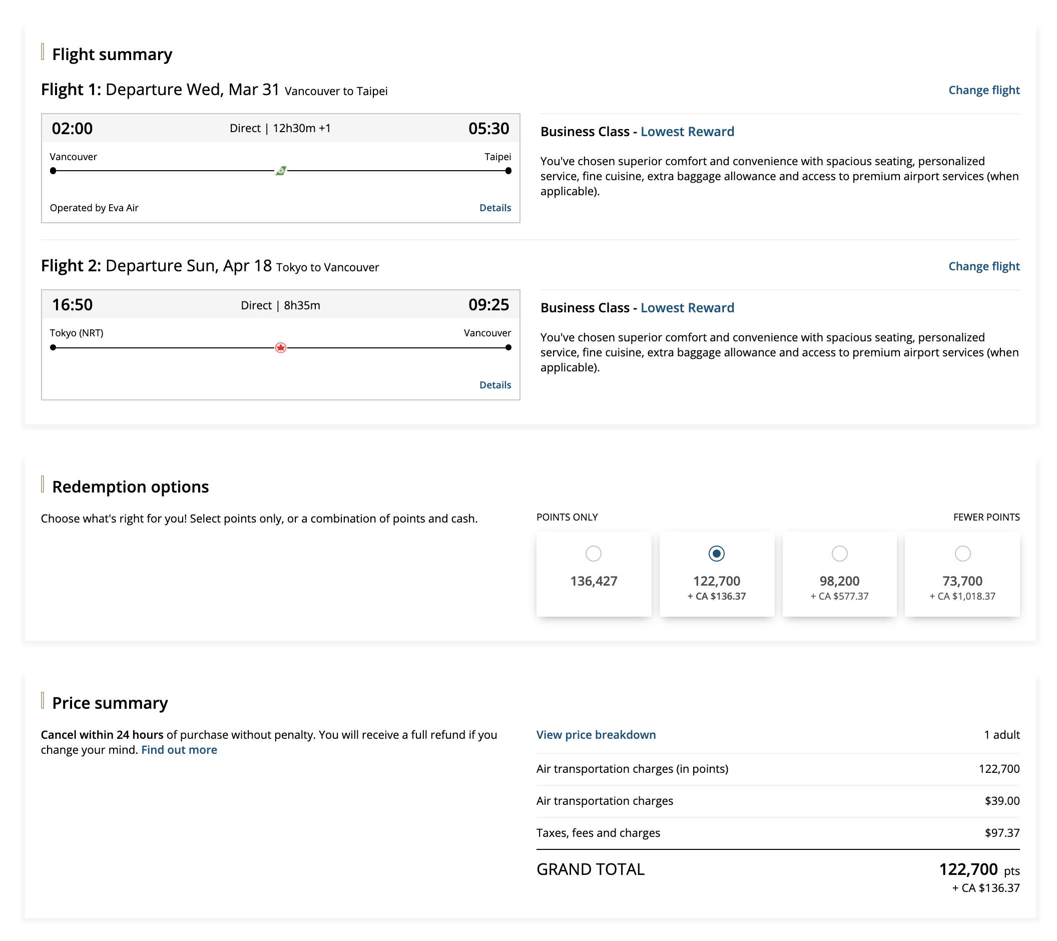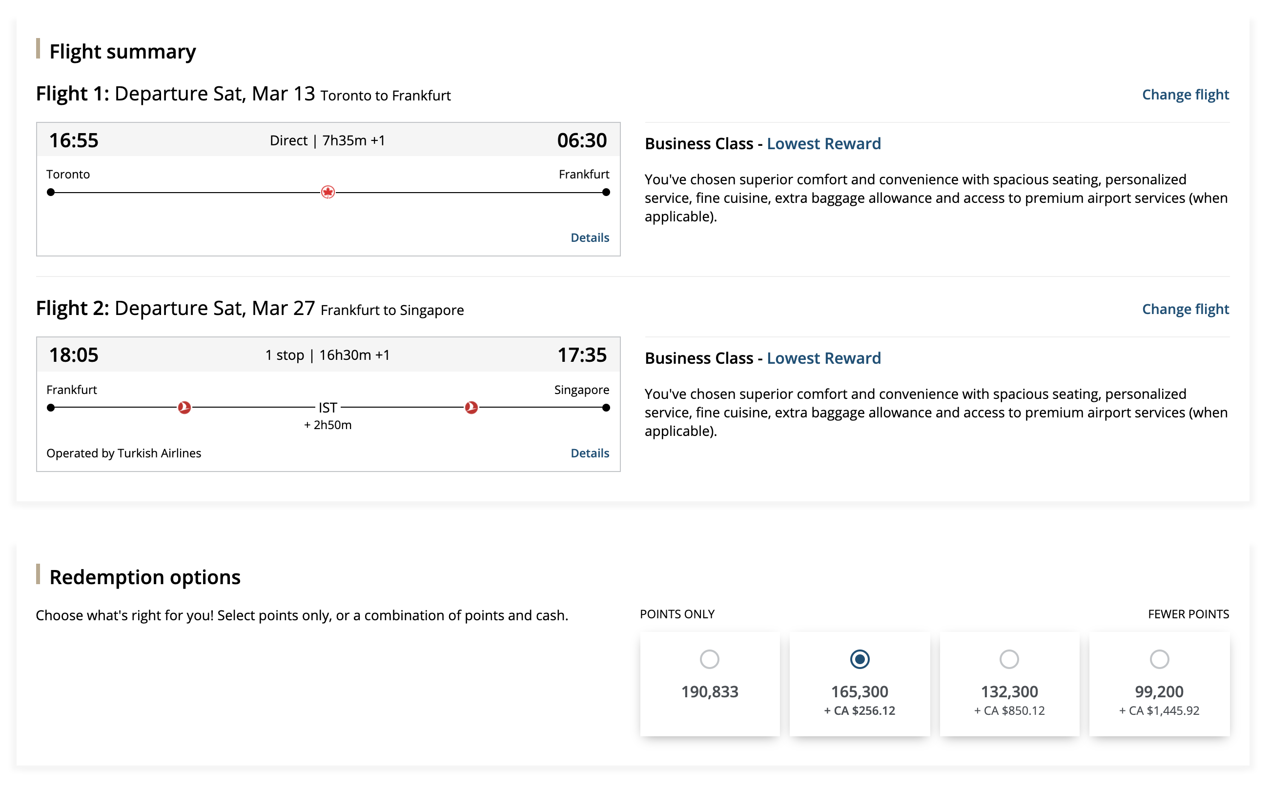 The booking confirmation gives you four separate “redemption options” under Points + Cash. If we run the numbers here, we see that we’re essentially being offered the chance to either sell Aeroplan points at 1 cent per point (cpp) or buy Aeroplan points at 1.8cpp.