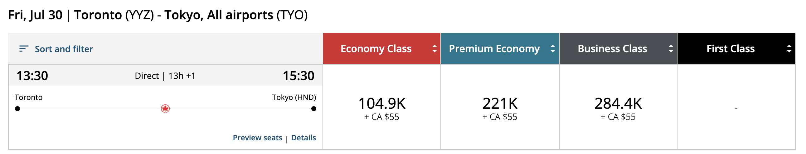 - First Flexible: ~14,000 Aeroplan points above First Lowest