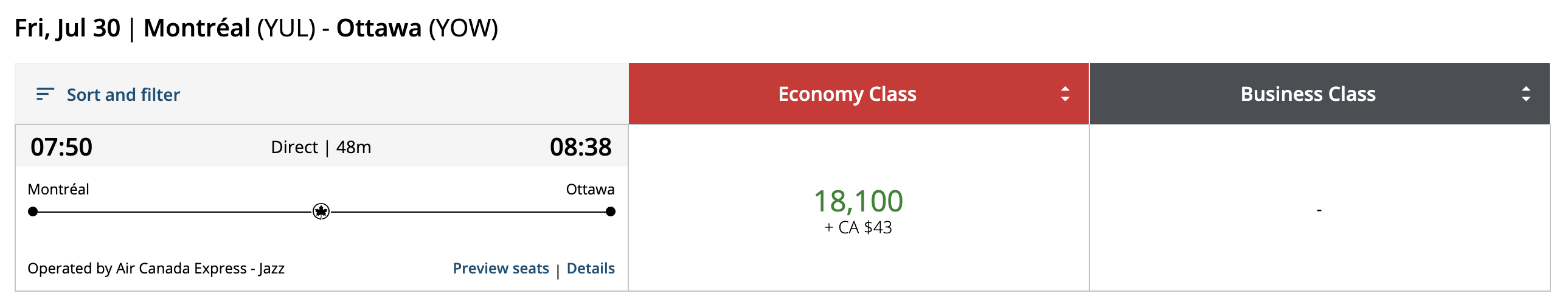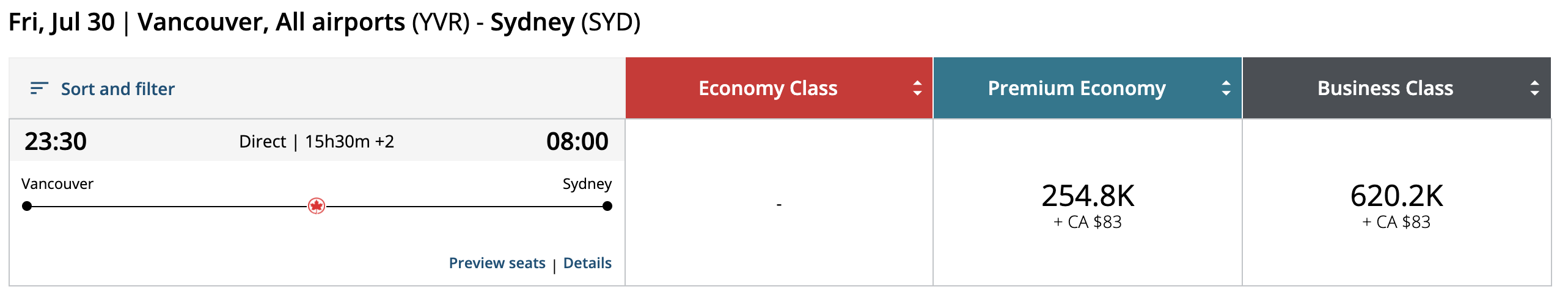 All of the above search results show up for an Aeroplan user who isn’t logged in. If you’re an Aeroplan member with Aeroplan Elite Status or a co-branded credit cards, then you’ll actually see reduced prices on Air Canada flights under the Preferred Pricing benefit.