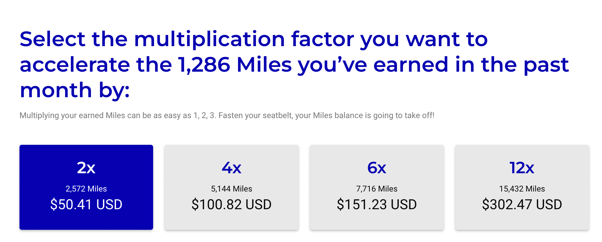 To clarify, by choosing these multiplier options, you’re effectively topping up your balance with an additional 2x, 4x, 6x, or 12x the miles earned in the past month.