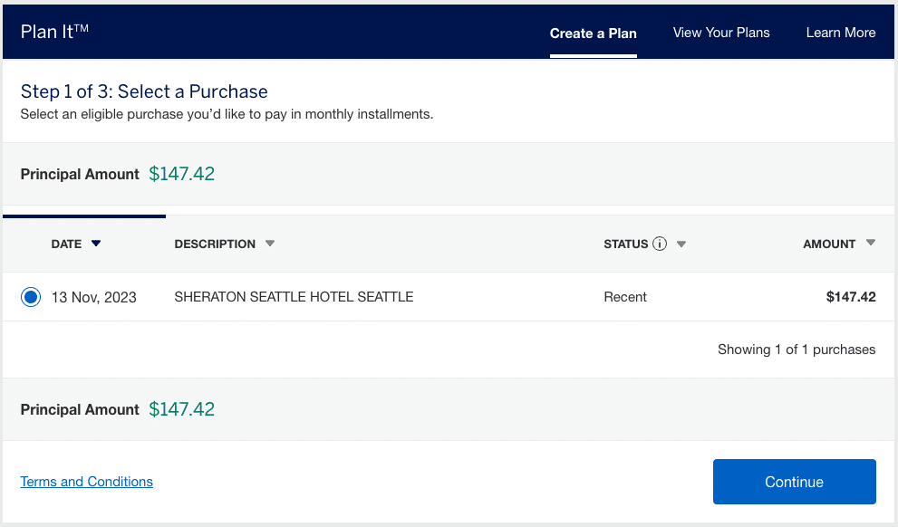 First, on your Plan It landing page (accessible through your American Express account), you’ll see a list of eligible purchases for which you can create a plan. On this screen, you can select one or more purchases, and the total of the principal amounts will be displayed.