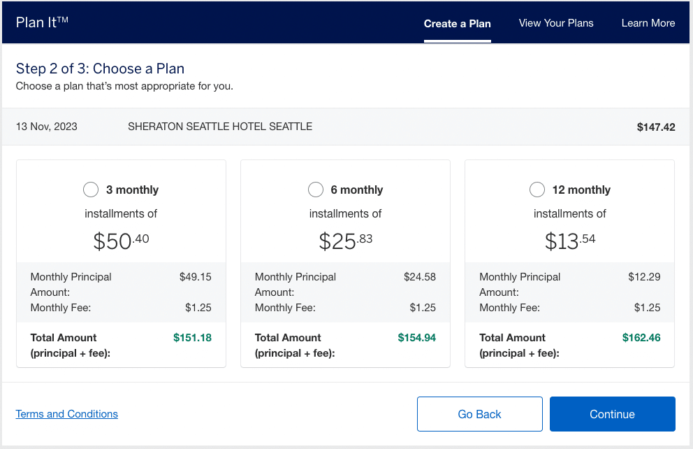 Next, you’ll see three options for Plan It installment plans. For each, you’ll see the monthly principal payment amount, the monthly fee, and the total monthly payment (principal + fee).