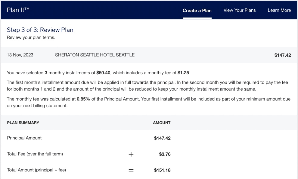 If you’re thinking about using Plan It, understand that it comes with a cost, which is clearly shown during setup. The rate you’re charged will vary, so it’s important to check the monthly fee calculation rate each time to see how it compares to your card’s annual interest rate.