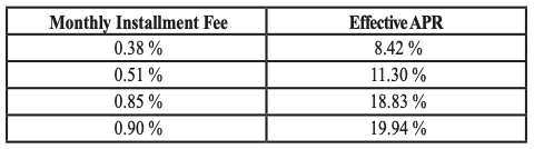 As you can see, a monthly installment fee of 0.90% equals an effective APR of 19.94%, while a fee of 0.38% equals an effective APR of just 8.42%.