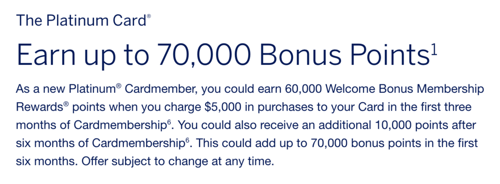 The current signup bonus is 60,000 Membership Rewards points, which you’d earn upon applying via referral link and then spending $5,000 in the first three months.
