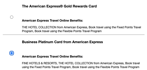 If you have multiple Amex cards, you’ll have a choice of which credit card you’d like to use. You’ll have to select either your Platinum Card or your Business Platinum Card.
