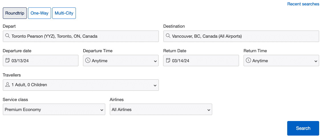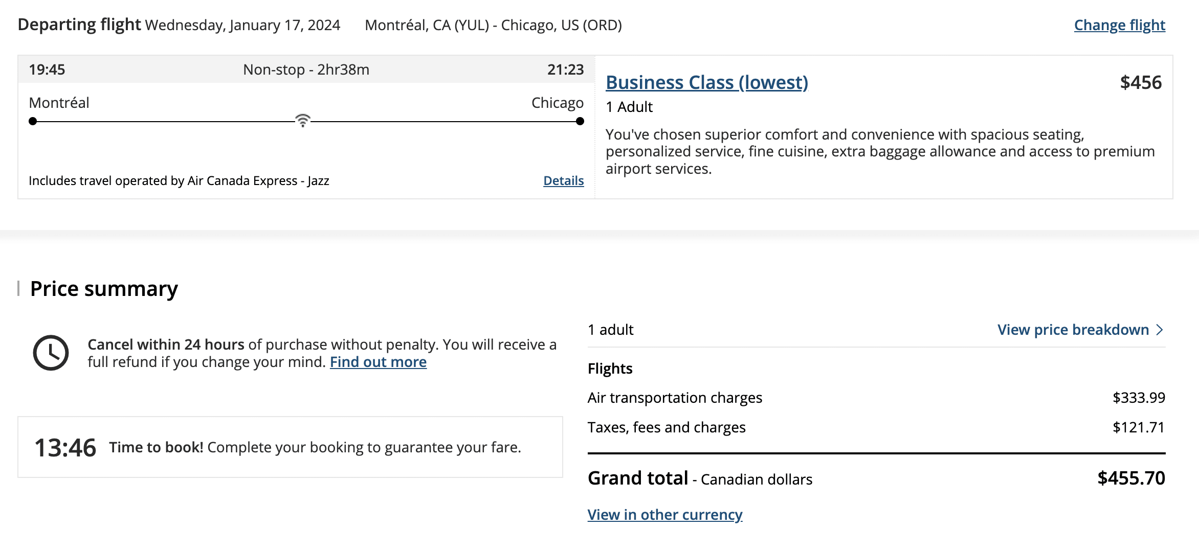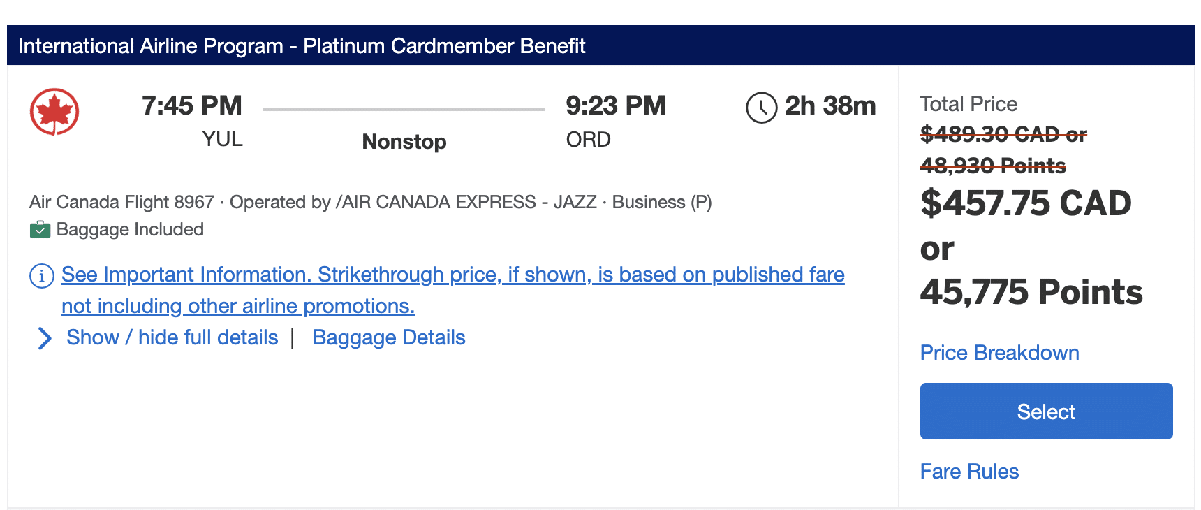 For another example, let’s take a look at a short one-way flight in Air Canada business class from Montreal to Chicago.
