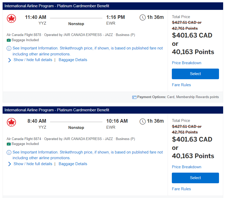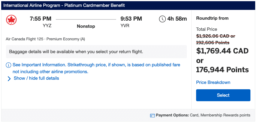 Another consideration is that you’re forced to use your Platinum Card to book the ticket. The points you’ll earn are based on the following rates:
