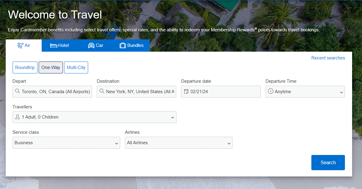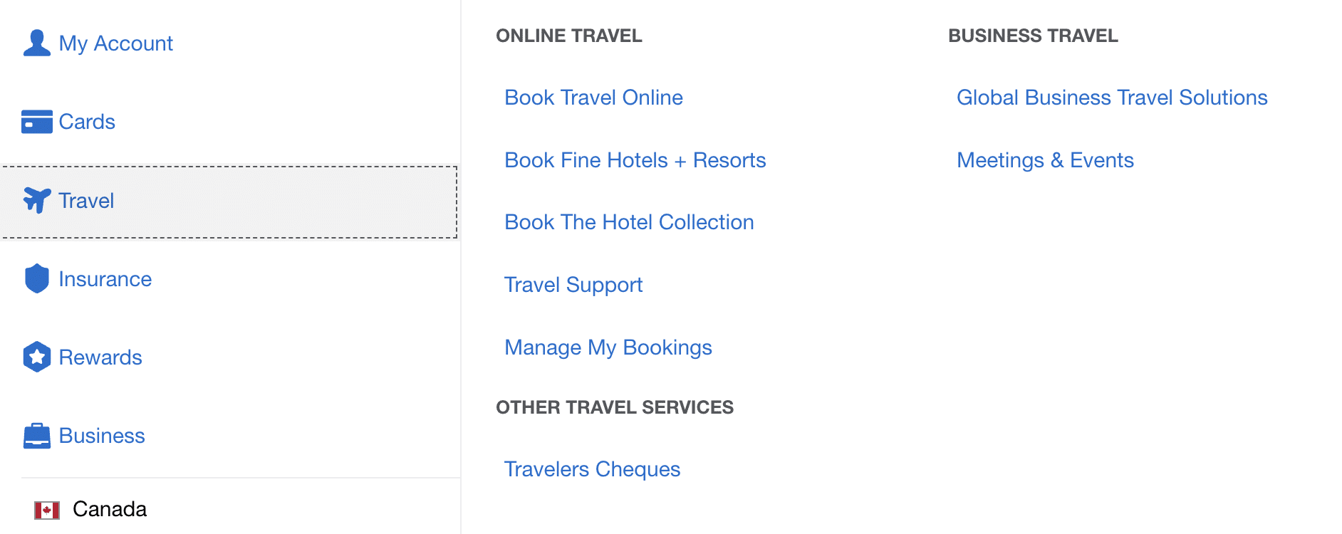 To book online, simply log into your Amex Canada account, and navigate to “Travel” under the “Menu” button. After that, select “Book Travel Online”.