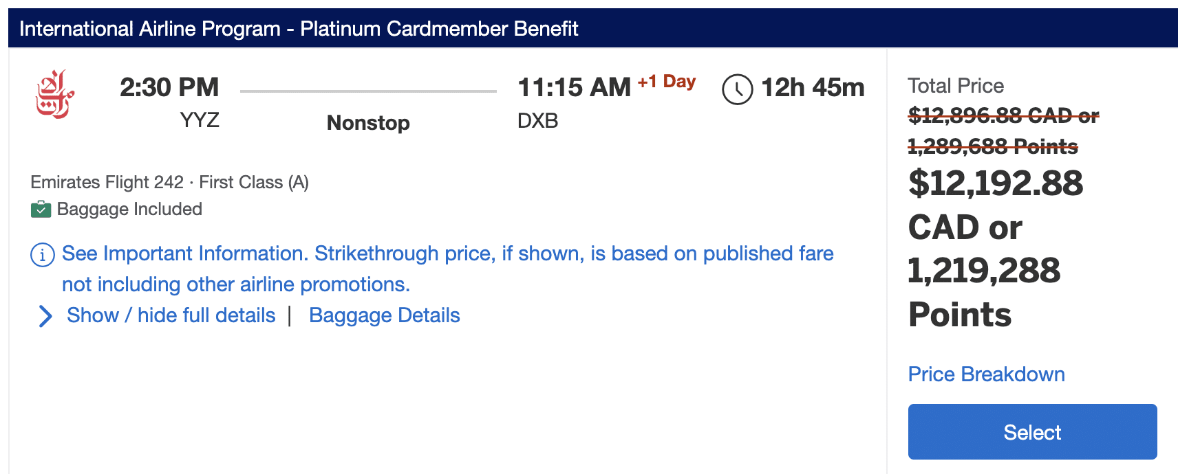 For example, a one-way Emirates First Class ticket from Toronto to Dubai costs $12,896 (all figures in CAD) when booked through Amex Travel. With the International Airline Program, it costs $12,192, which corresponds to $704 in savings.