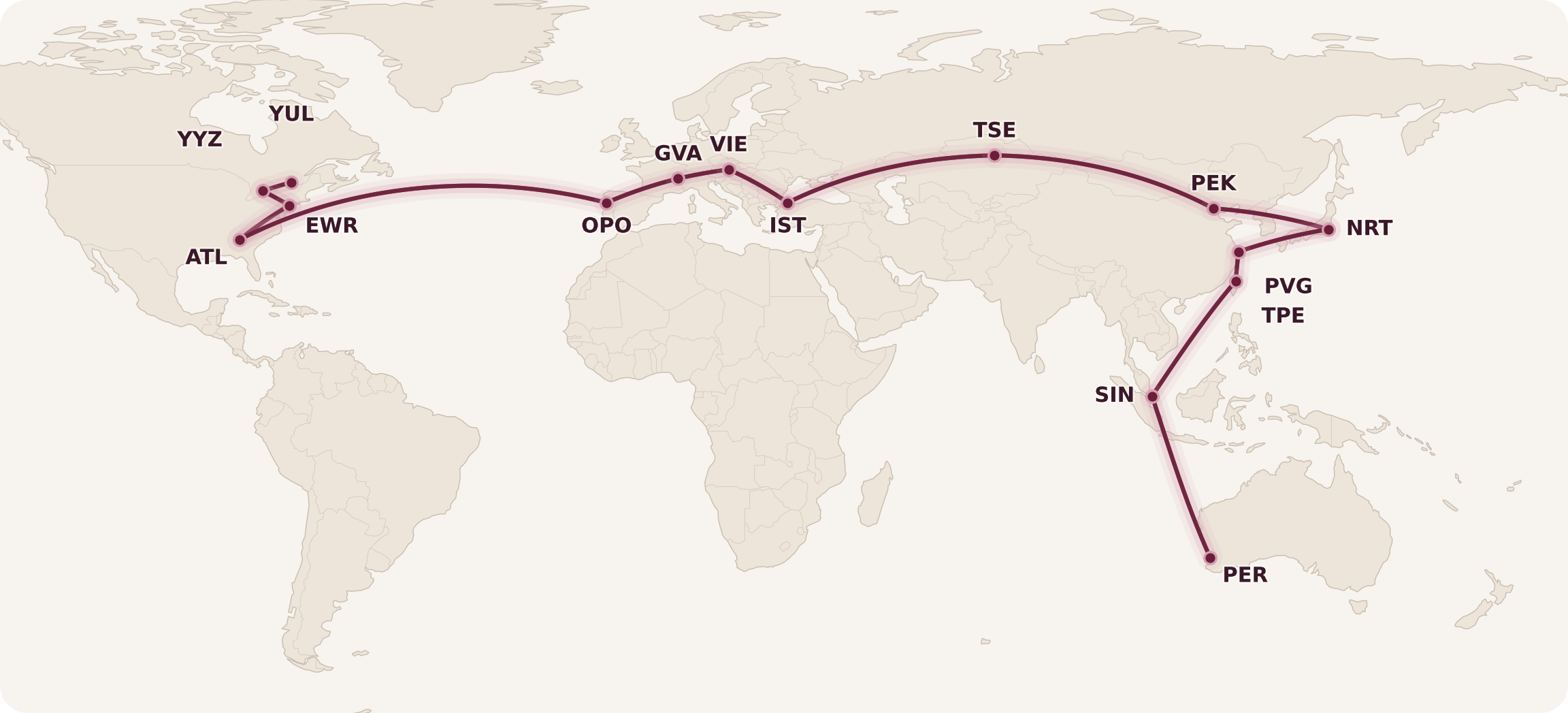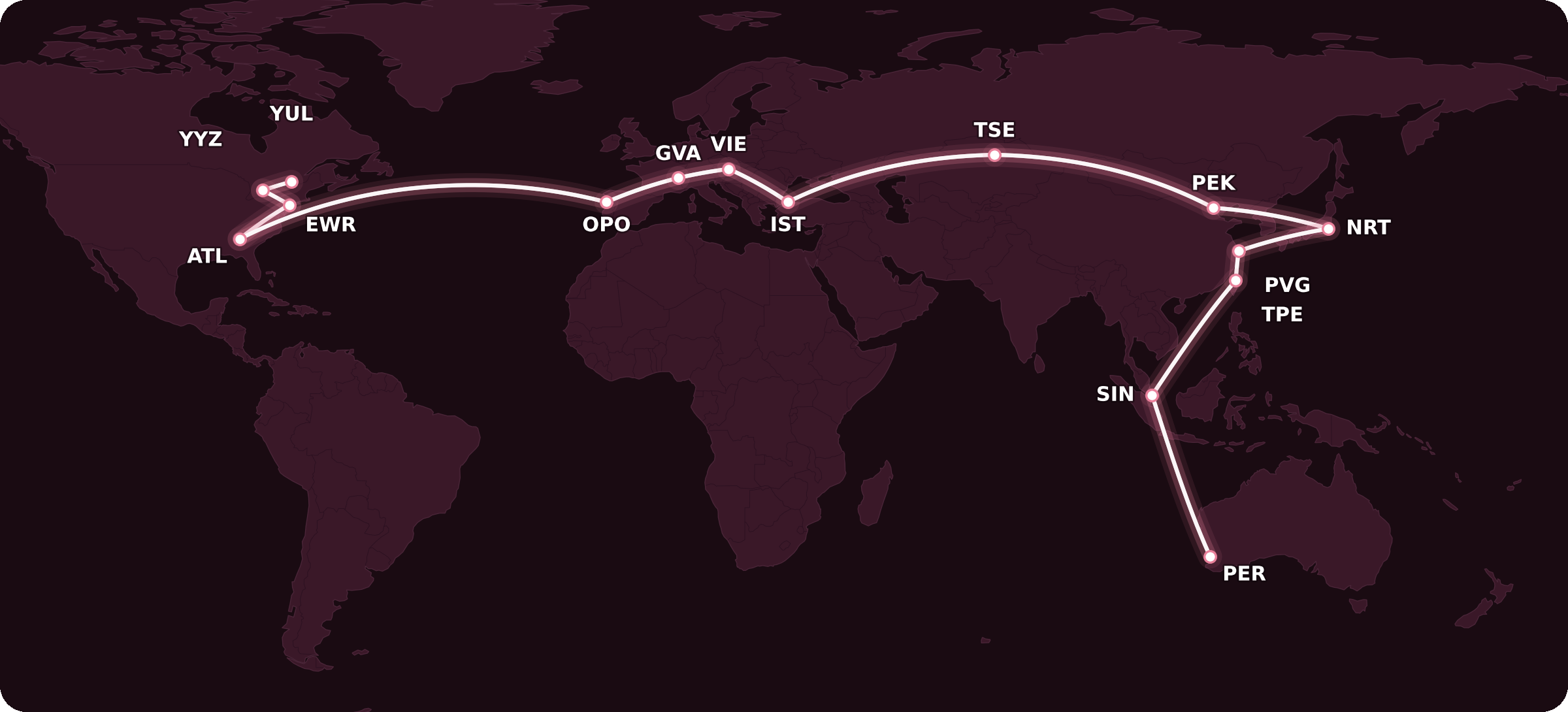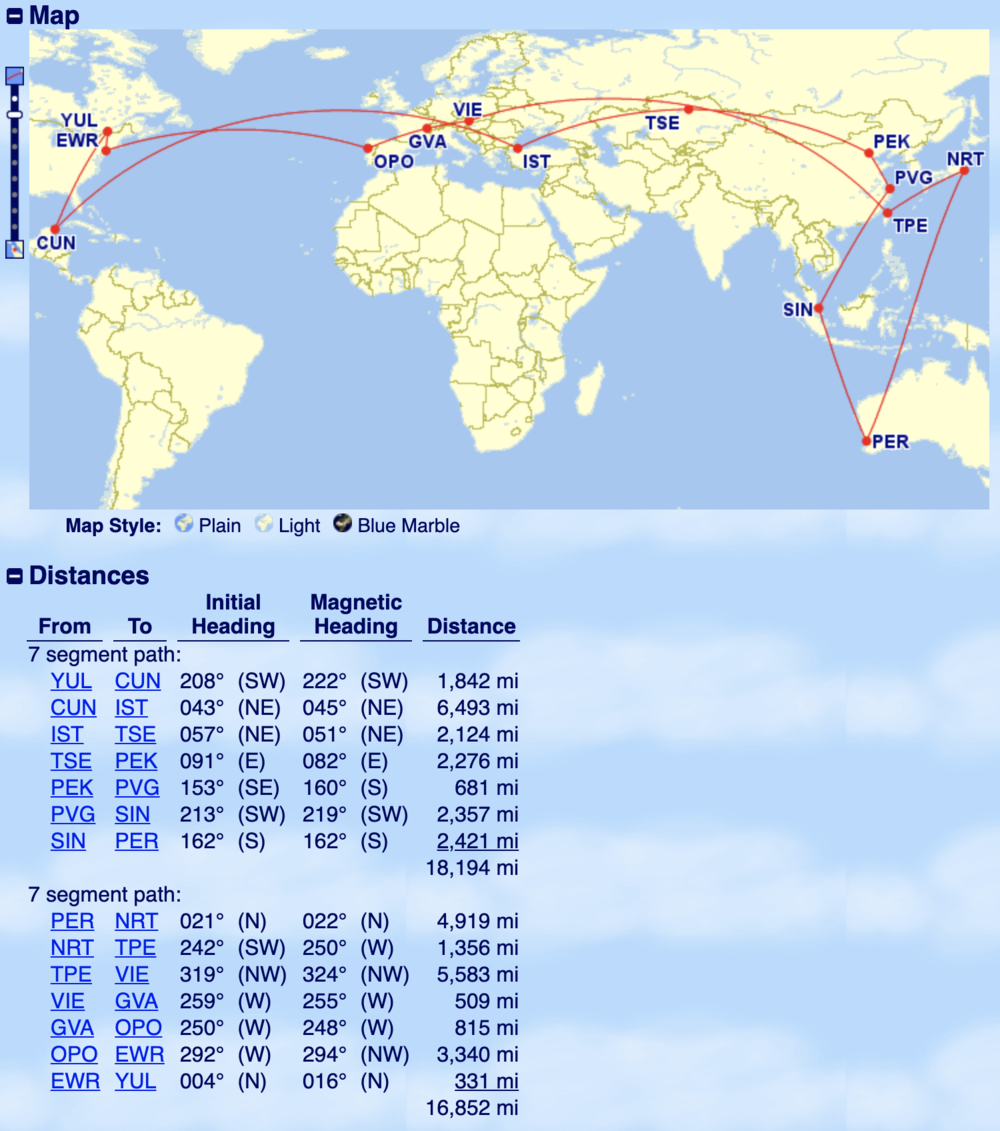 With the “bones” of the trip in place, I just needed to “connect the dots” in a way that satisfied the MPM for the Montreal–Perth city pair, which is 18,204 miles.