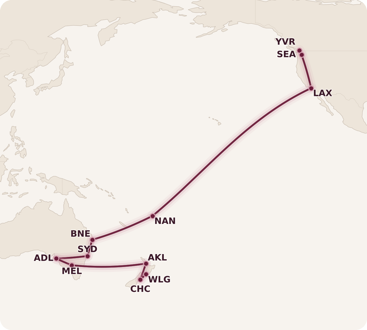 The final itinerary looked as follows (with the Aeroplan itinerary in red, and the planned side-trips in blue). It really is a thing of beauty, isn’t it?