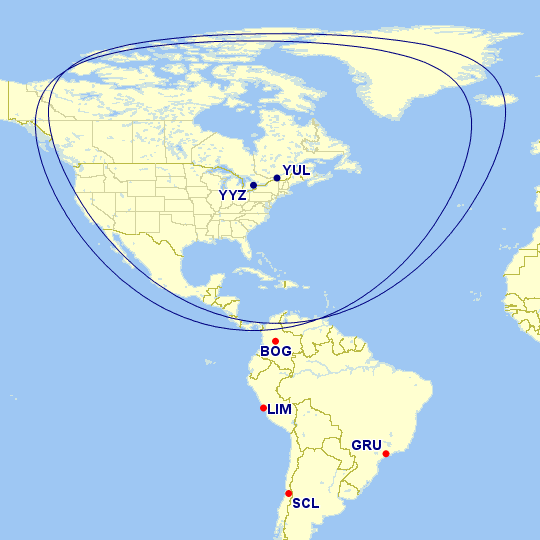 As your origin city moves farther south in North America, you will be able to fly farther into South America while staying within the first distance band.