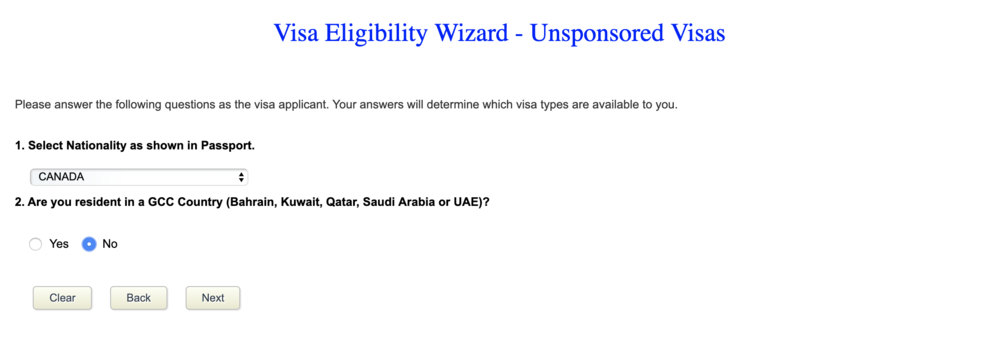 You’ll be taken to a Visa Eligibility Wizard, which asks you for your country of nationality and whether you’re a resident of a fellow Gulf Cooperation Council country (Bahrain, Kuwait, Qatar, Saudi Arabia, UAE).