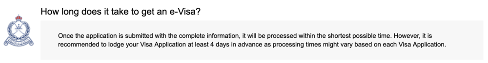 First off, the Royal Oman Police website states that travellers are required to apply for their Oman e-Visas at least four days and no more than one month before they plan to arrive in Oman. Unfortunately, I did not heed this advice, having continually put off the task until only three days before arrival. At that point, I frantically submitted the visa application, crossing my fingers that I’d receive it in time despite having missed the prescribed time period.