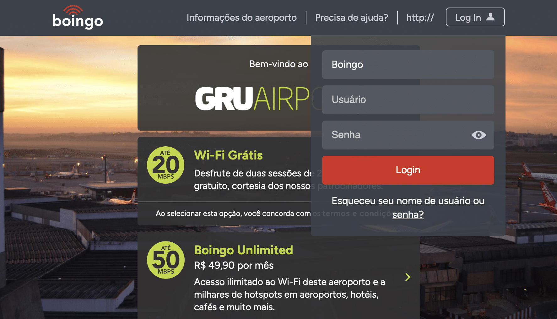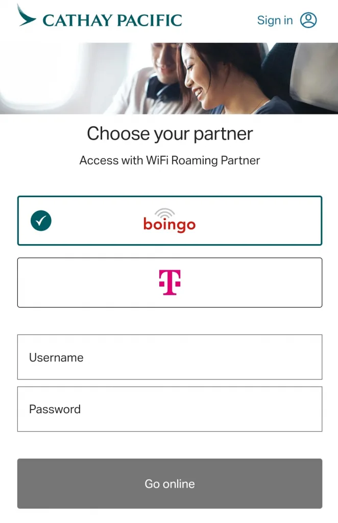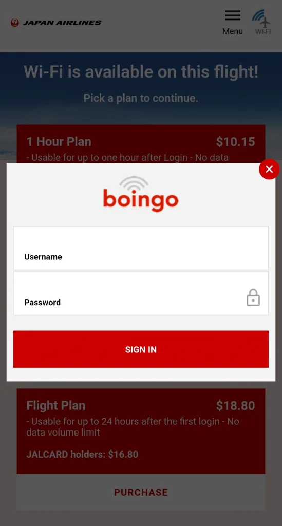 You’ll then be prompted to enter your username and password, which are the same ones you use for any other Boingo login.