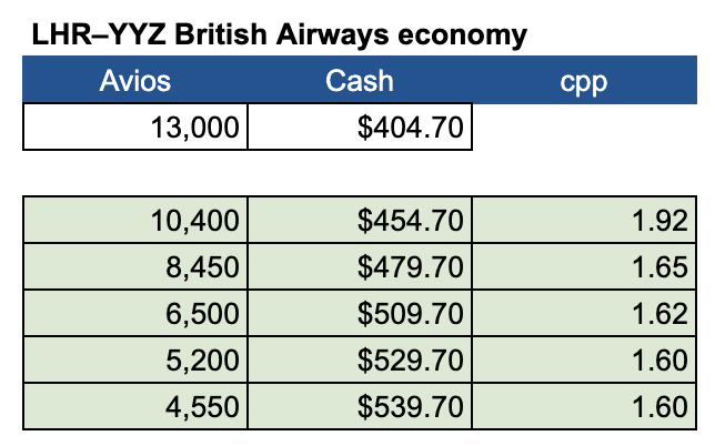 On the green side, the valuations aren’t very attractive either – I’d never be interested in acquiring Avios for 2.5cpp+ when there are so many easier ways to earn them in Canada. In this scenario, the “true” price of 4,000 Avios + $41 is definitely the best option, and it’s a real shame that the program has basically chosen to bury this option among a range of decoy redemptions.