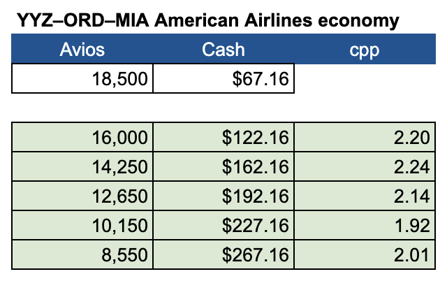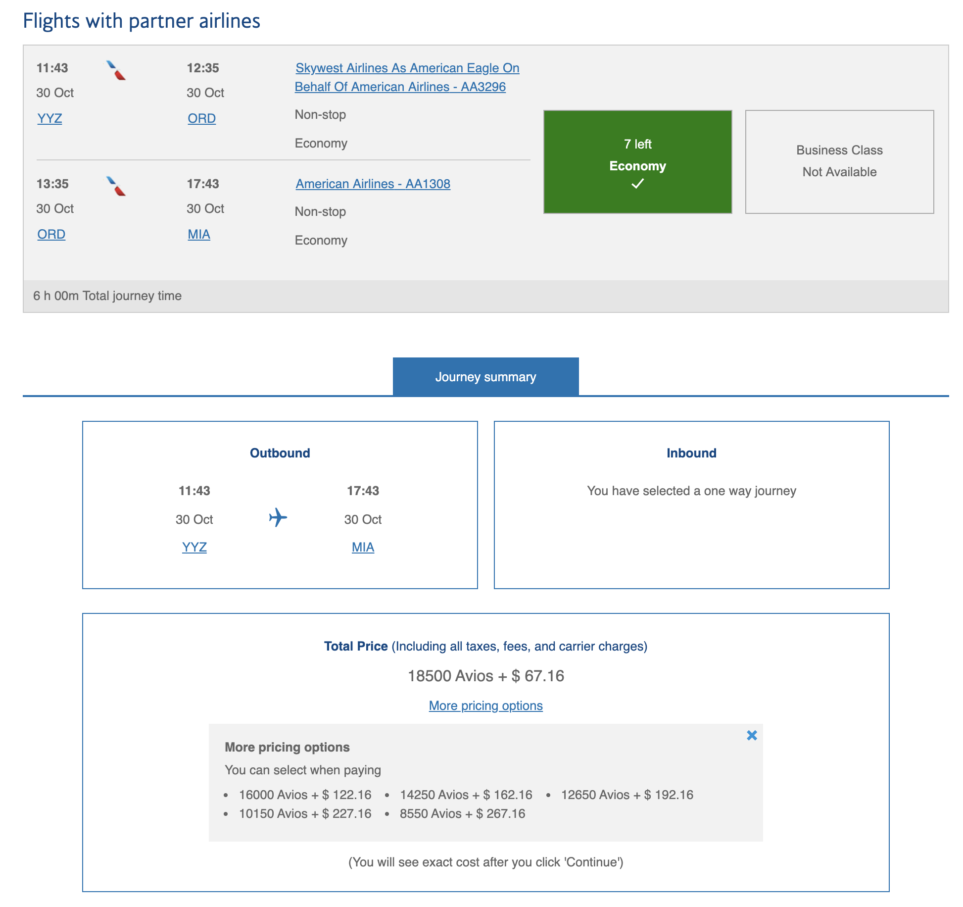 It’s important to note that the effective valuations we calculated above are not constant; instead, they vary based on the specific redemption you’re looking at. For example, here are the Avios and Money options being offered for a Toronto–Chicago–Miami one-way flight in American Airlines economy class:
