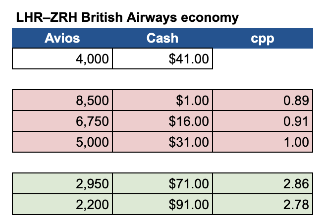Here, we show the “true” price of the London–Zurich British Airways economy class flight and calculate the valuations at which you’re effectively selling Avios (when you pay more Avios and less cash, highlighted in red) or buying Avios (when you pay fewer Avios and more cash, highlighted in green):