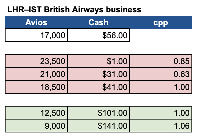 We can do some math here to figure out the effective value at which you’re buying back your Avios. We take the difference in cash and divide that by the difference in Avios to obtain the cents per point (cpp) valuation: