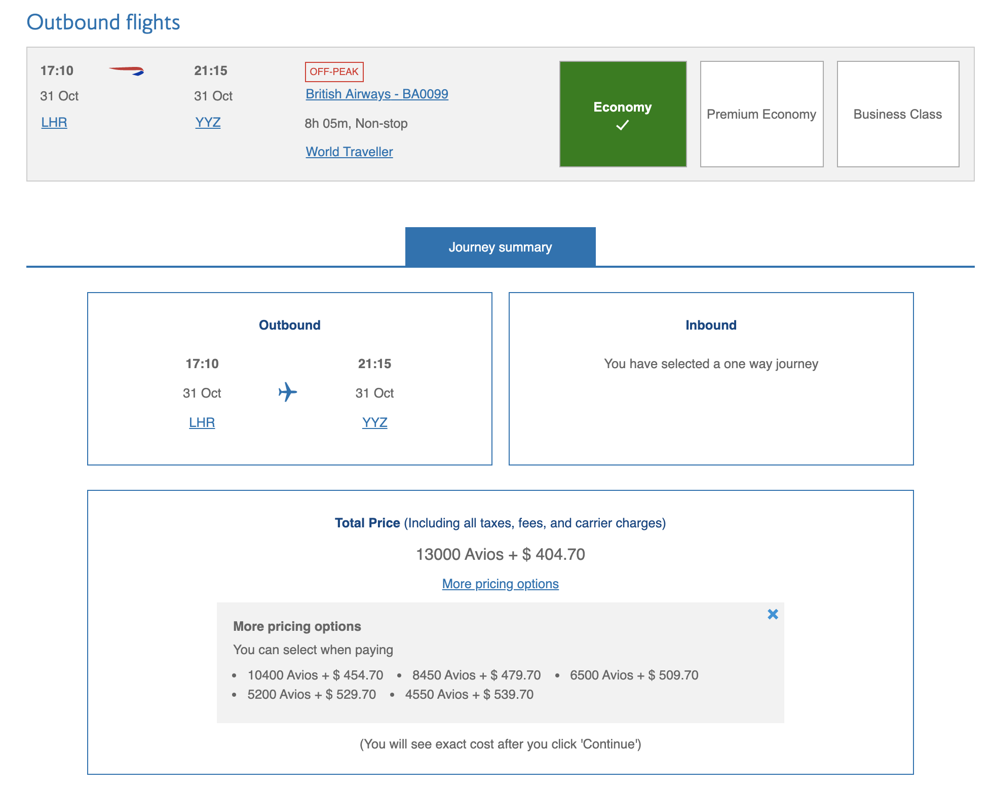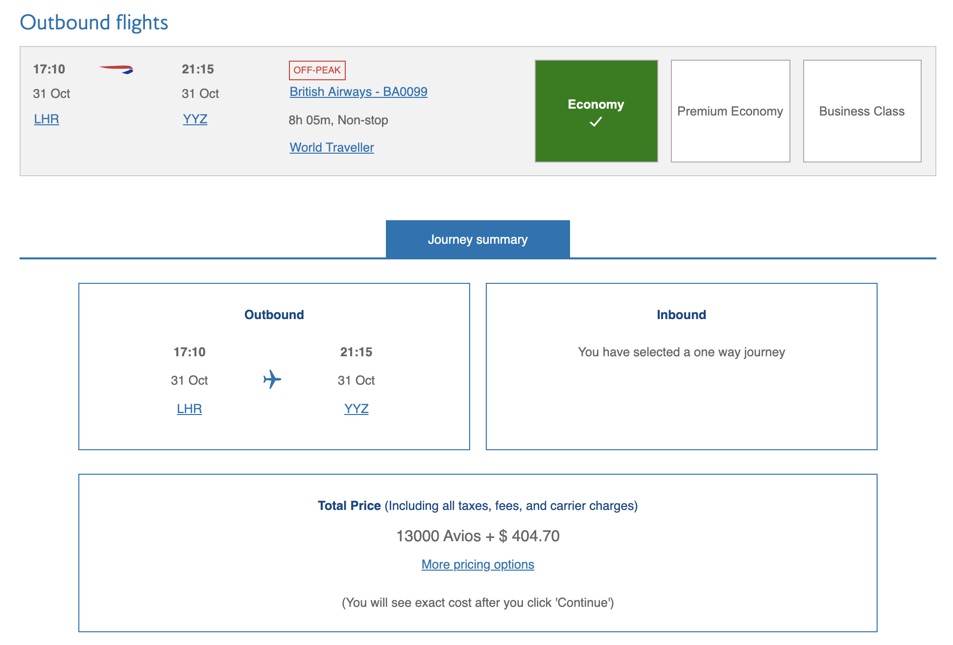 Most commonly, whenever you select a flight, you’ll at first be presented with the “true” Avios cost based on the award charts above. For example, let’s search for a one-way flight from London to Toronto in British Airways economy class on an off-peak date. London to Toronto spans 3,567 miles, so we look this up against the British Airways chart and arrive at a cost of 13,000 Avios for “Zone 5”.