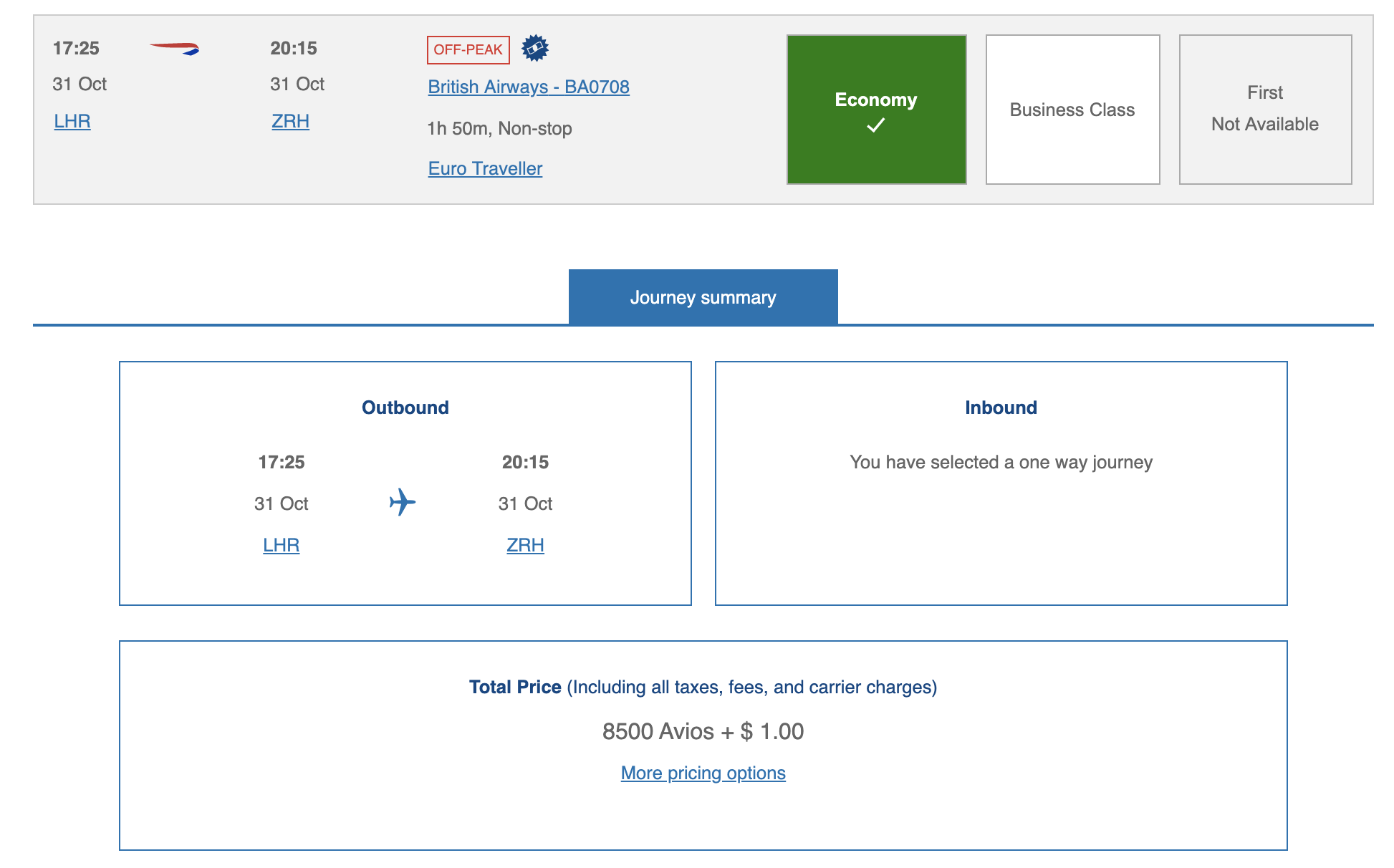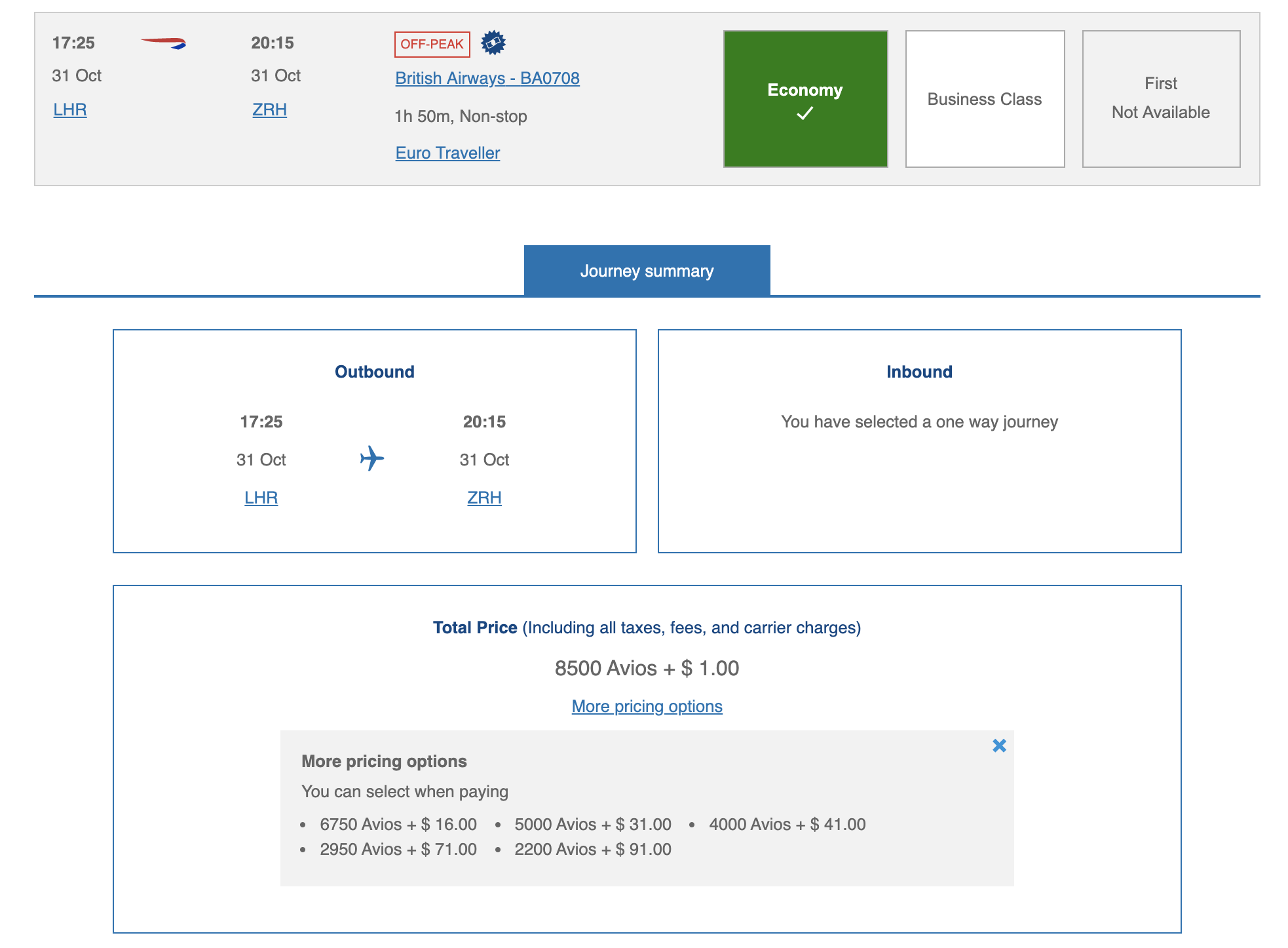 However, when you click on a flight, the default price that’s displayed is 8,500 Avios + $1. That’s a lot more Avios than I was expecting to pay!