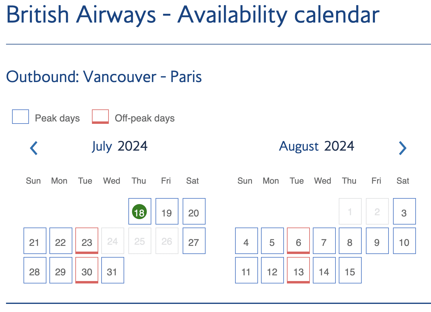 It’s easy to tell which dates have peak and off-peak pricing on The British Airways Club website.