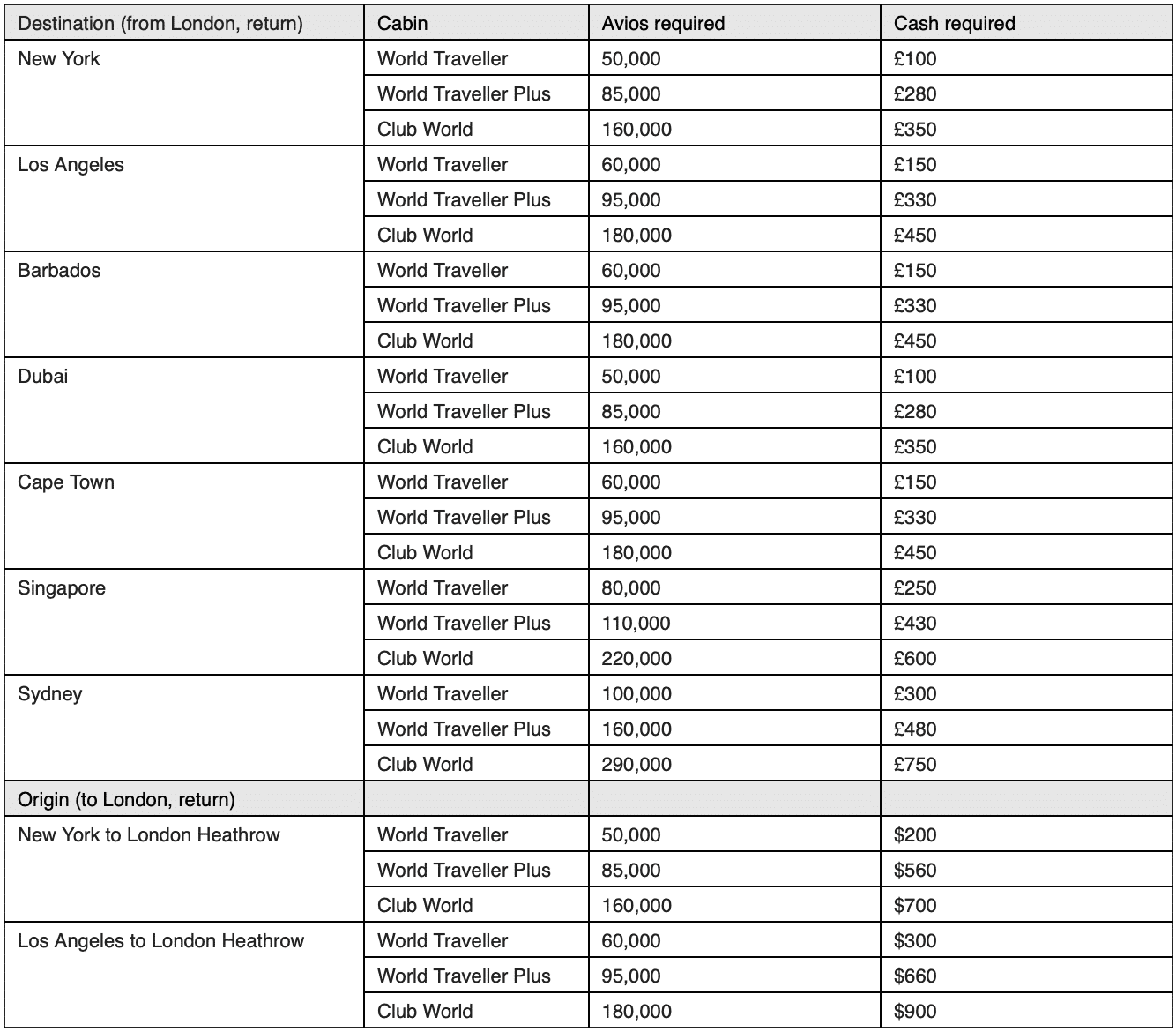 (In July 2024, British Airways increased the amount of cash required by £12 or $25 (USD/CAD) for all Reward Flight Saver bookings except for economy redemptions within Europe. Therefore, you’d need to add £24 or $50 to the prices on the below chart).