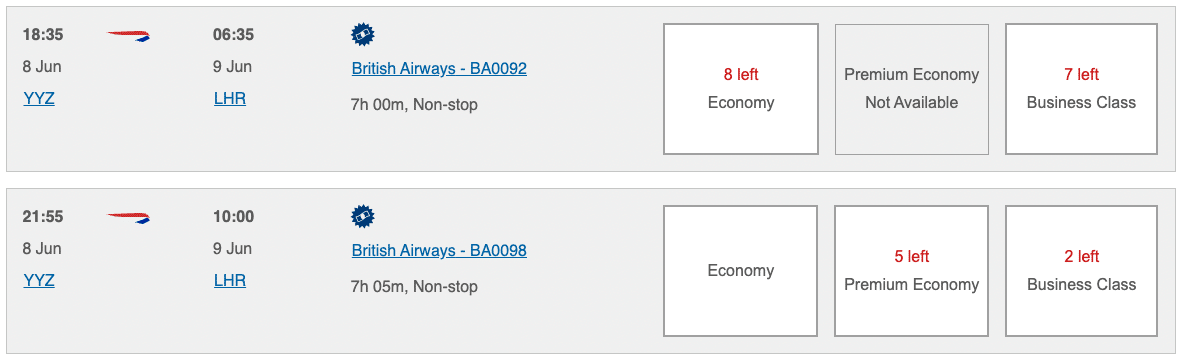 Keep in mind that British Airways releases a minimum of 14 award seats on every flight: eight seats in economy, two in premium economy, and four in business class.