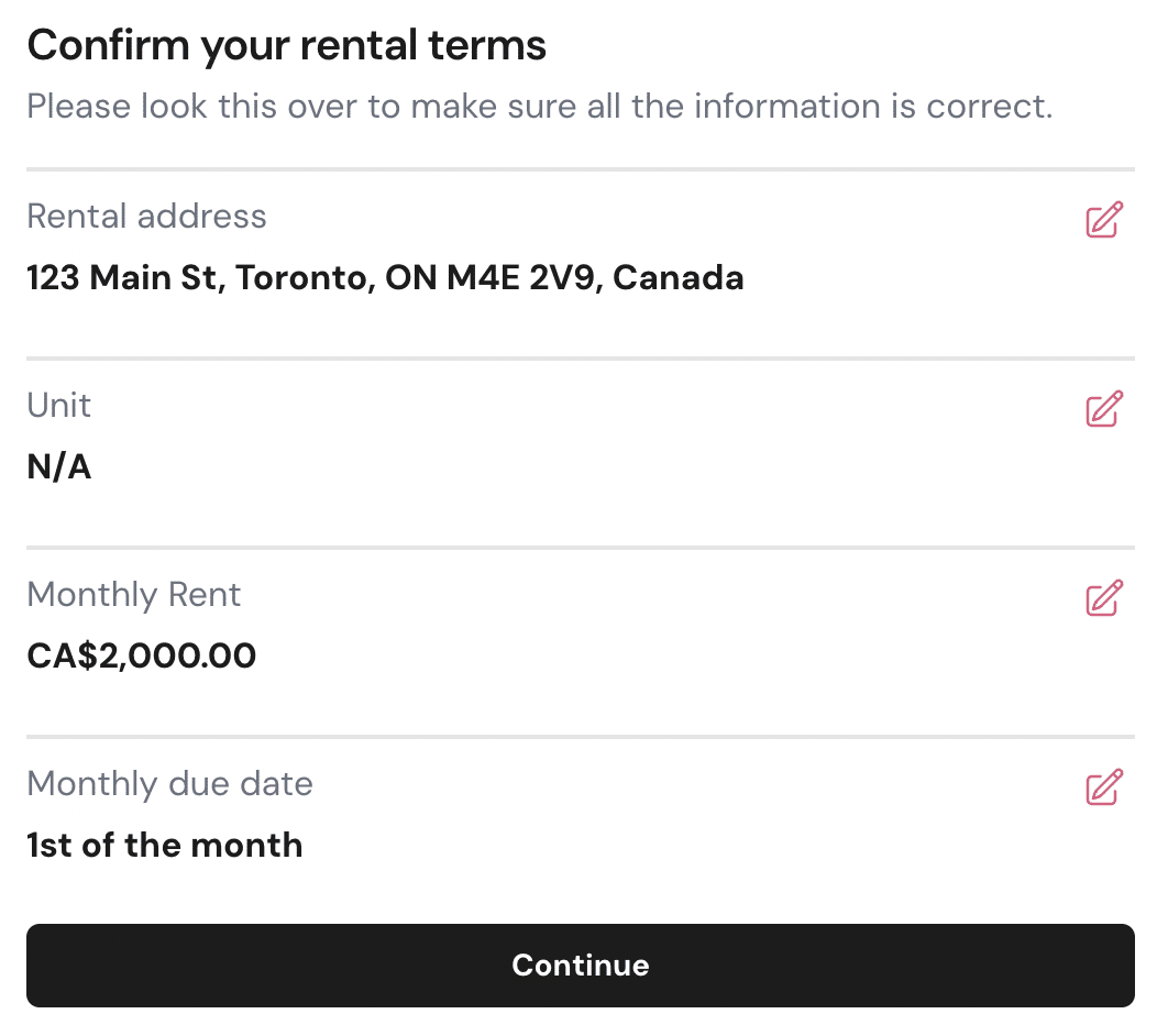 To set up a recurring rent payment, you’d first need to enter your landlord and rental information, including your monthly rent and payment date. Payments can be made via Interac e-Transfer, pre-authorized debit, or Bill Pay, depending on your landlord.