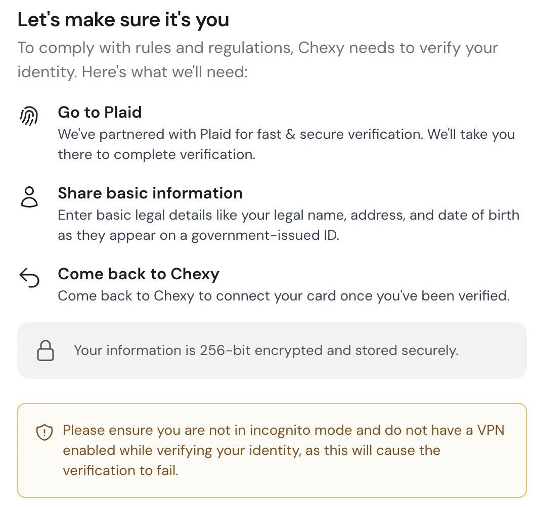 Then, as a verification measure, you’ll need to verify your identity by clicking through to Plaid, an identify verification service that Chexy partners with. The process takes just a few minutes, and you’ll be asked to provide some information and photo identification.