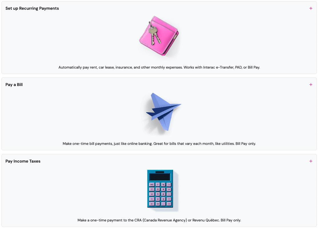 Under the recurring bills feature, you can set up automatic payments each month for rent, car lease payments, insurance payments, condo/strata fees, internet/cable bills, and more.