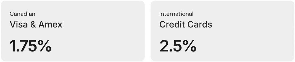 Canadian-issued American Express and Visa cards are subject to a 1.75% fee, whereas international American Express, Mastercard, and Visa products are subject to a 2.5% processing fee. At this time, Canadian-issued Mastercard products aren’t accepted.