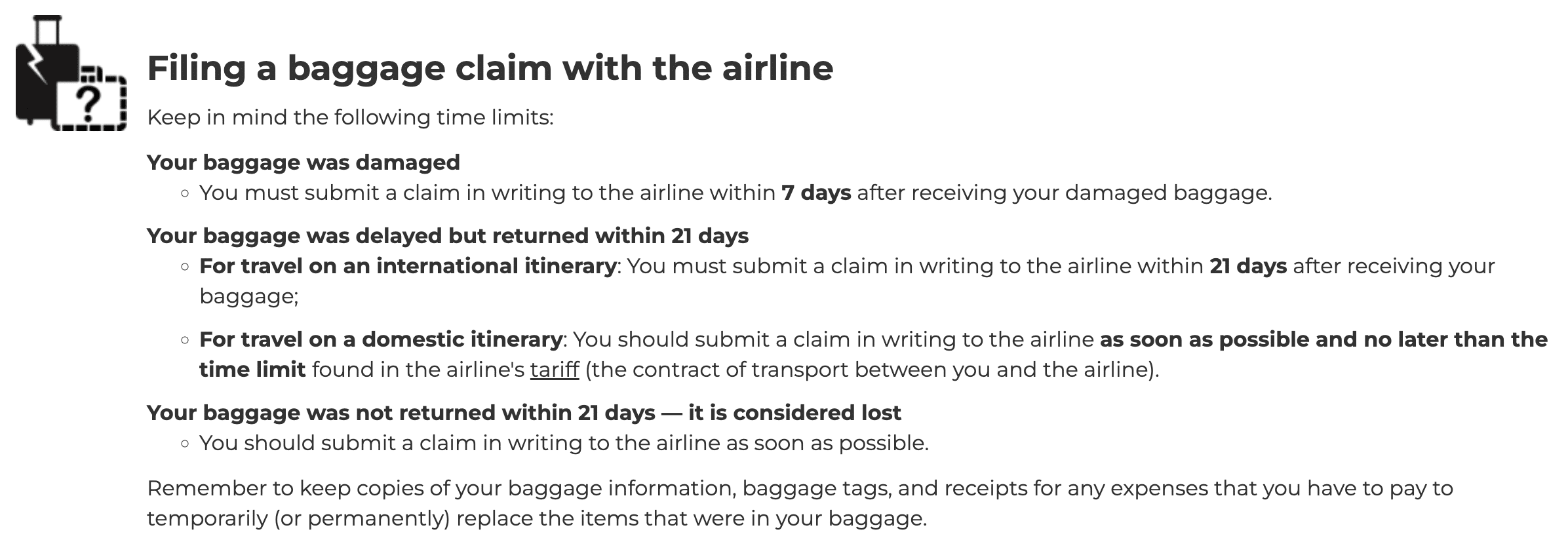 For delayed baggage on domestic flights within Canada, you’ll have to consult the airline’s tariff for timelines. For example, you have 21 days to submit a delayed baggage claim with Air Canada and WestJet.