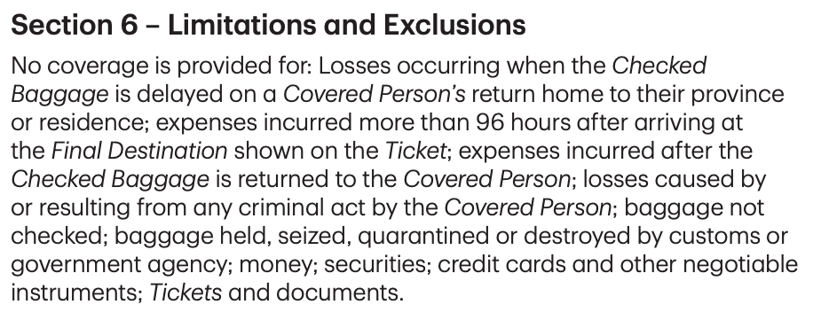 However, baggage delay insurance is also only applicable on outbound flights. If you arrive back home and your baggage is delayed, you aren’t covered.