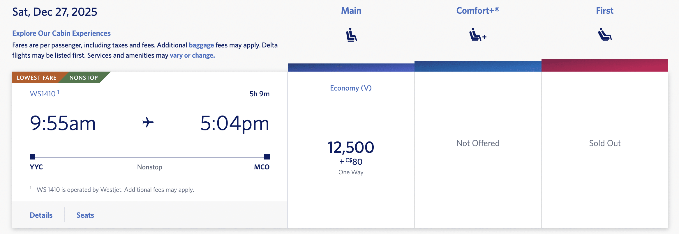 Alternatively, when cash fares for WestJet are high, be sure to check award availability through Delta SkyMiles. In general, SkyMiles redemptions on WestJet to Orlando don’t give the greatest value but if the cash fares are high, then it may make sense, since the cost in points is fixed.