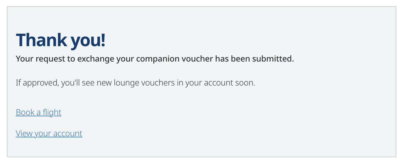 Be careful: clicking the “Exchange Now” button will submit the request, and you won’t be able to undo the transaction. Once your request is submitted, you’ll receive the two lounge vouchers in your account within four days.