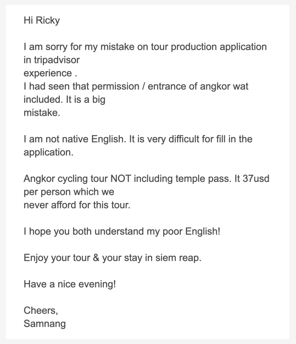 It’s worth noting that the TripAdvisor page also states that admission tickets to Angkor Wat are included as well, which was not the case – indeed, shortly after booking the tour, I received a “very apologetic” message from the tour operator as follows: