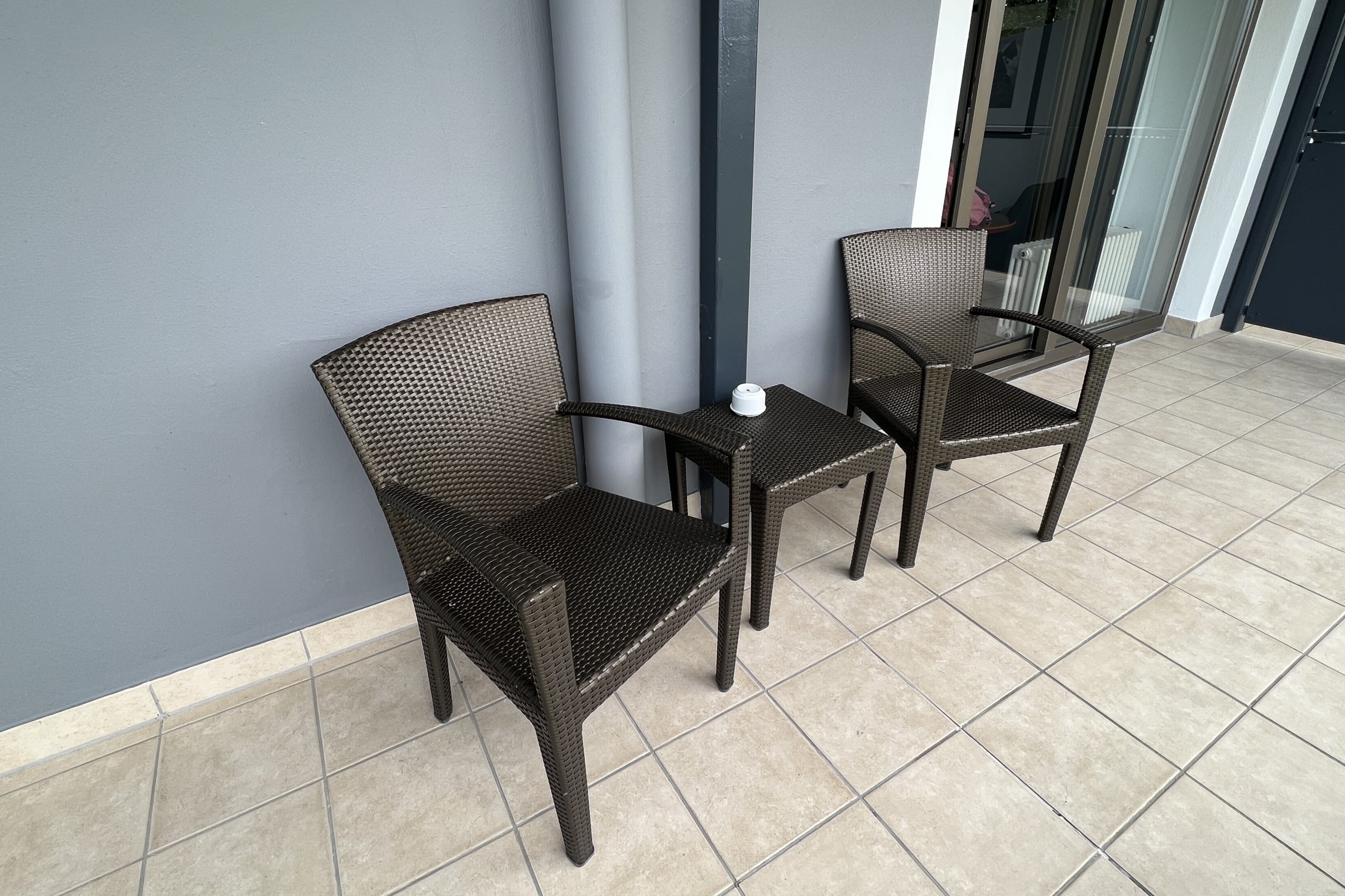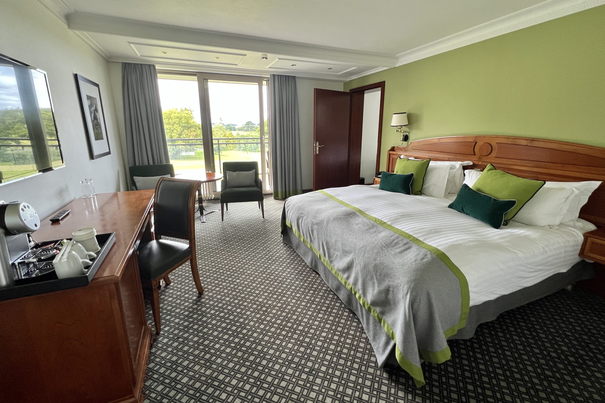 The main room had a king bed, a desk with a Nespresso machine, a small table, and two arm chairs. The windows open up onto a small balcony with a couple of chairs.