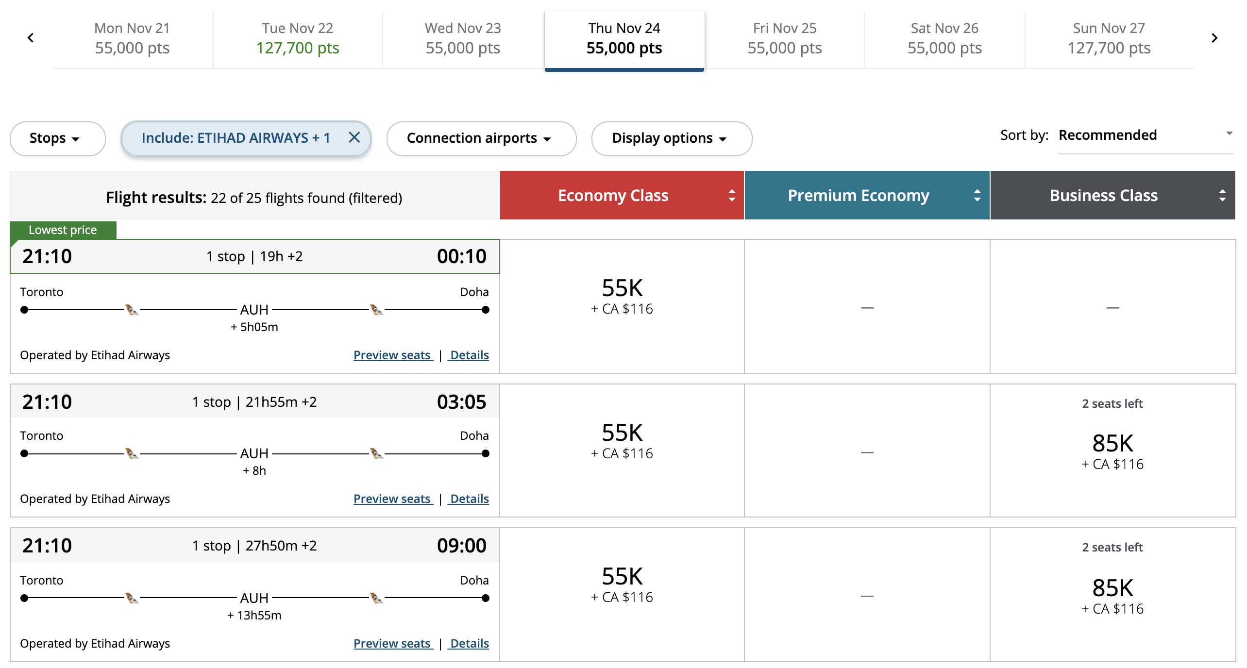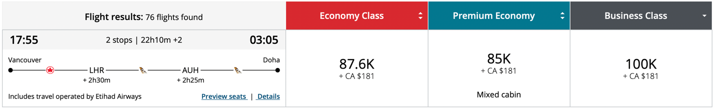 With Aeroplan points, you can take advantage of ample availability on Etihad Airways’s Toronto–Abu Dhabi route on the Etihad 787 Business Studio. Adding on a short-haul flight to Doha, the whole thing would cost you 85,000 Aeroplan points per direction.