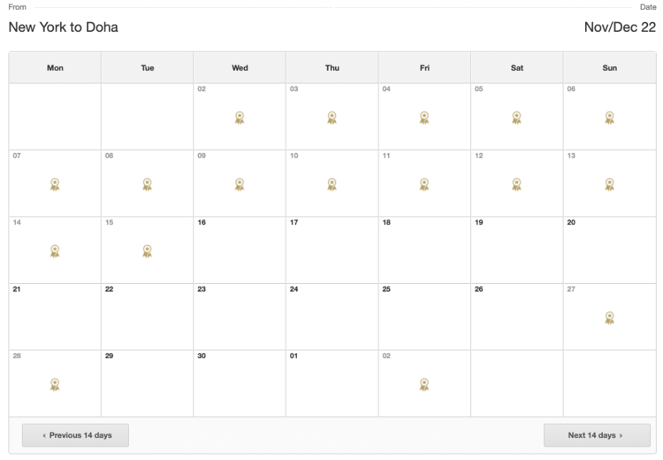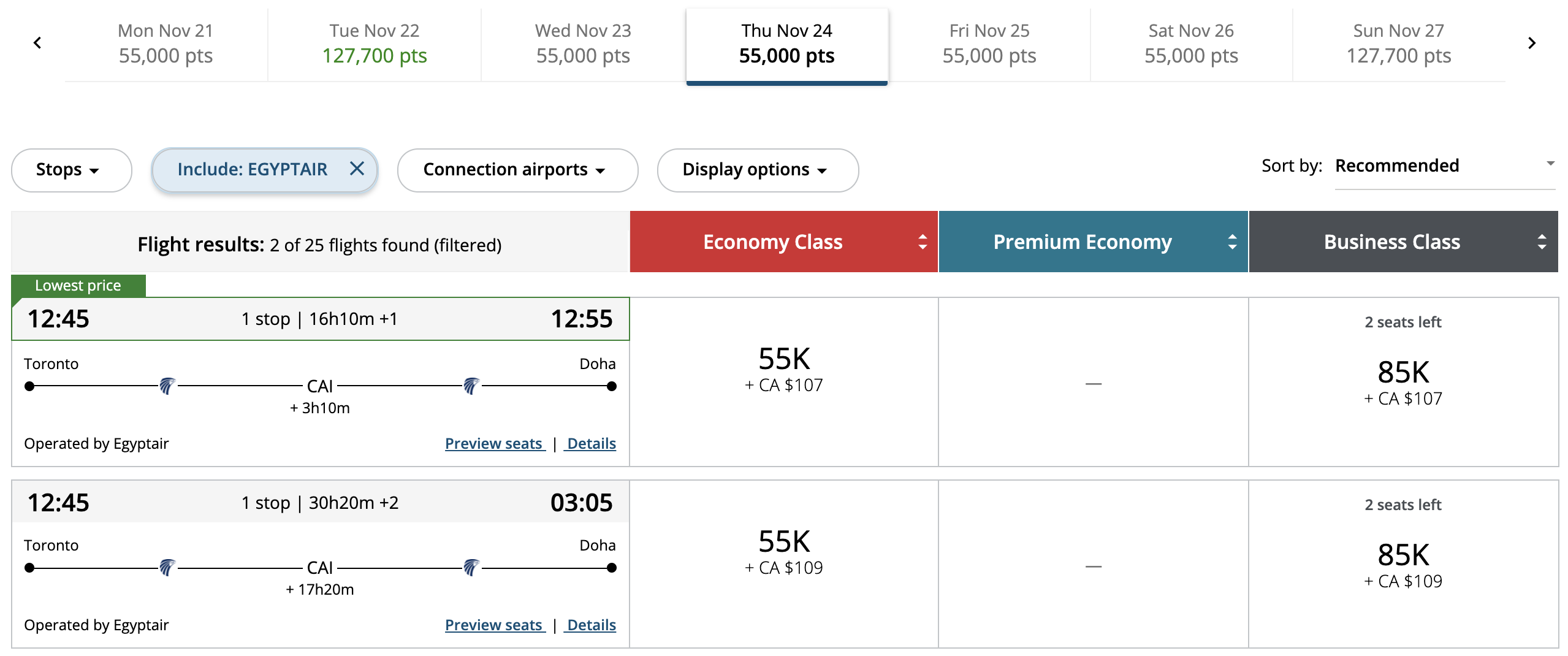 There are a few options outside of Aeroplan points to consider, although they’re more limited. That’s because Qatar Airways, known for their Qsuites business class and a natural choice of airline en route to the World Cup, appears to have zeroed-out their long-haul business class award availability during the World Cup period (starting at about November 10–15).