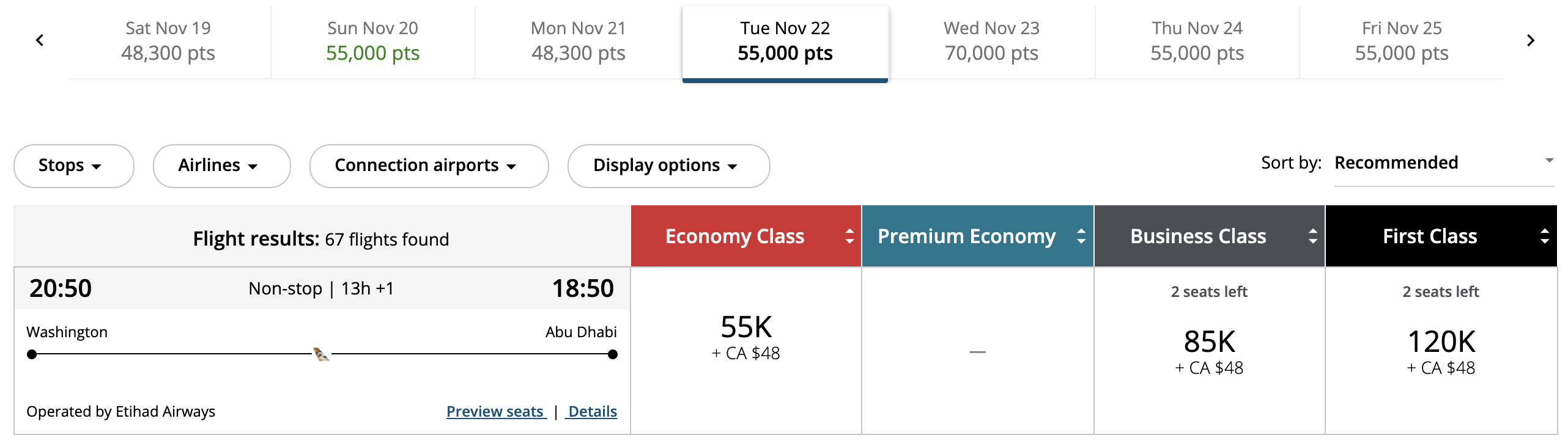 You could even travel in Etihad Airways 787 First Class on the Washington–Abu Dhabi route for 120,000 Aeroplan points.