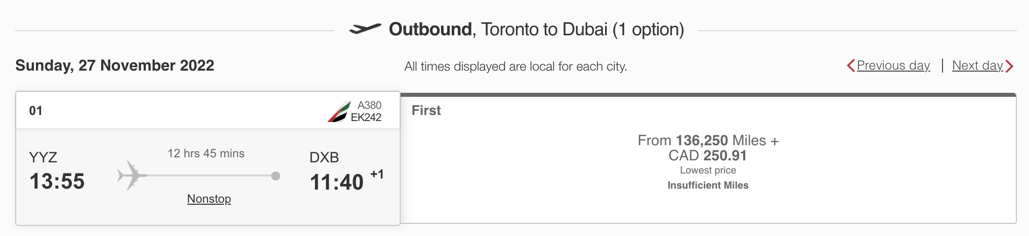 From any other Canadian origin city besides Toronto, you’ll most likely need to connect via Toronto or a US gateway city in order to book a partner flight to the Middle East at a reasonable points price.