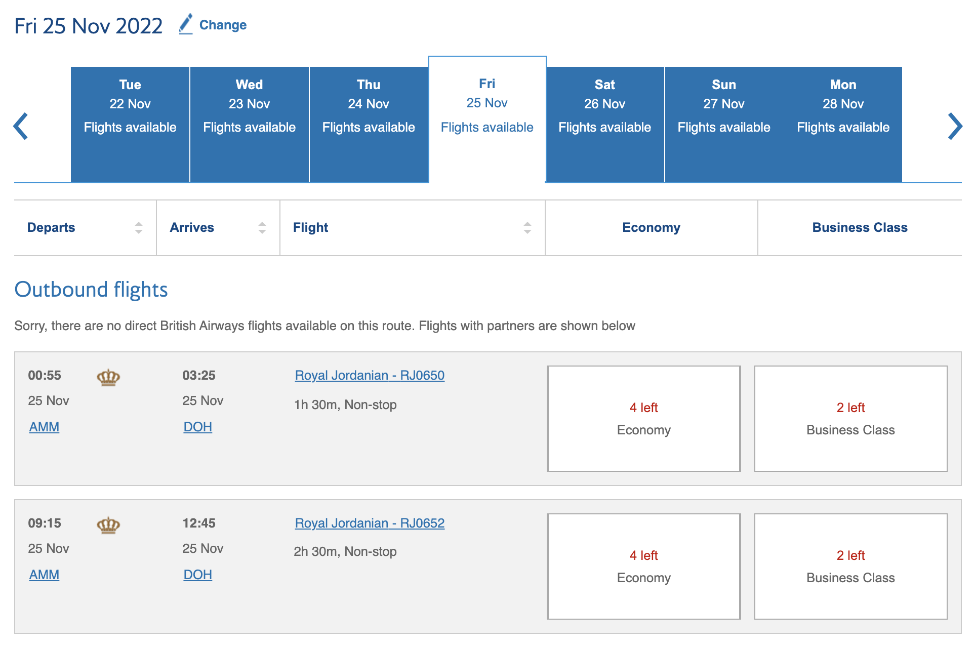 …as well as Royal Jordanian’s Amman–Doha flight for 9,000 Avios in economy or 16,500 Avios in business class.