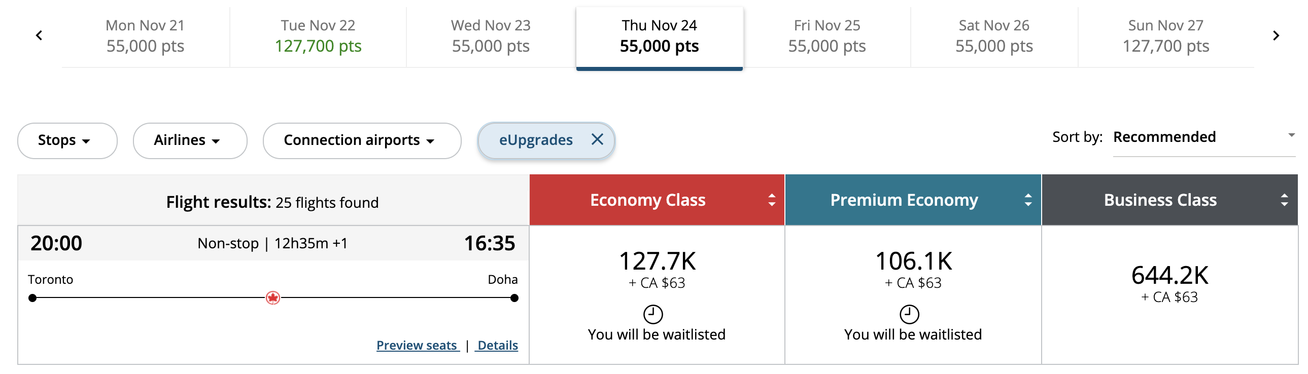 Air Canada does operate a direct Toronto–Doha flight, although business class pricing is dynamically high during the tournament dates, and eUpgrade space is also zeroed out for the time being (which is understandable, since Air Canada is presumably very confident of selling these seats for cash).