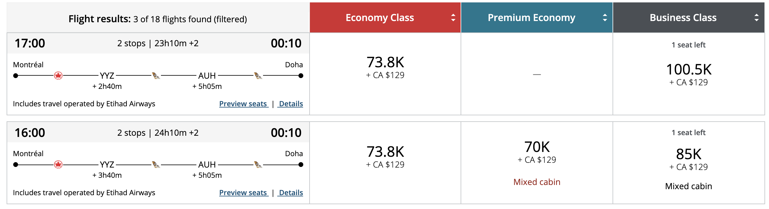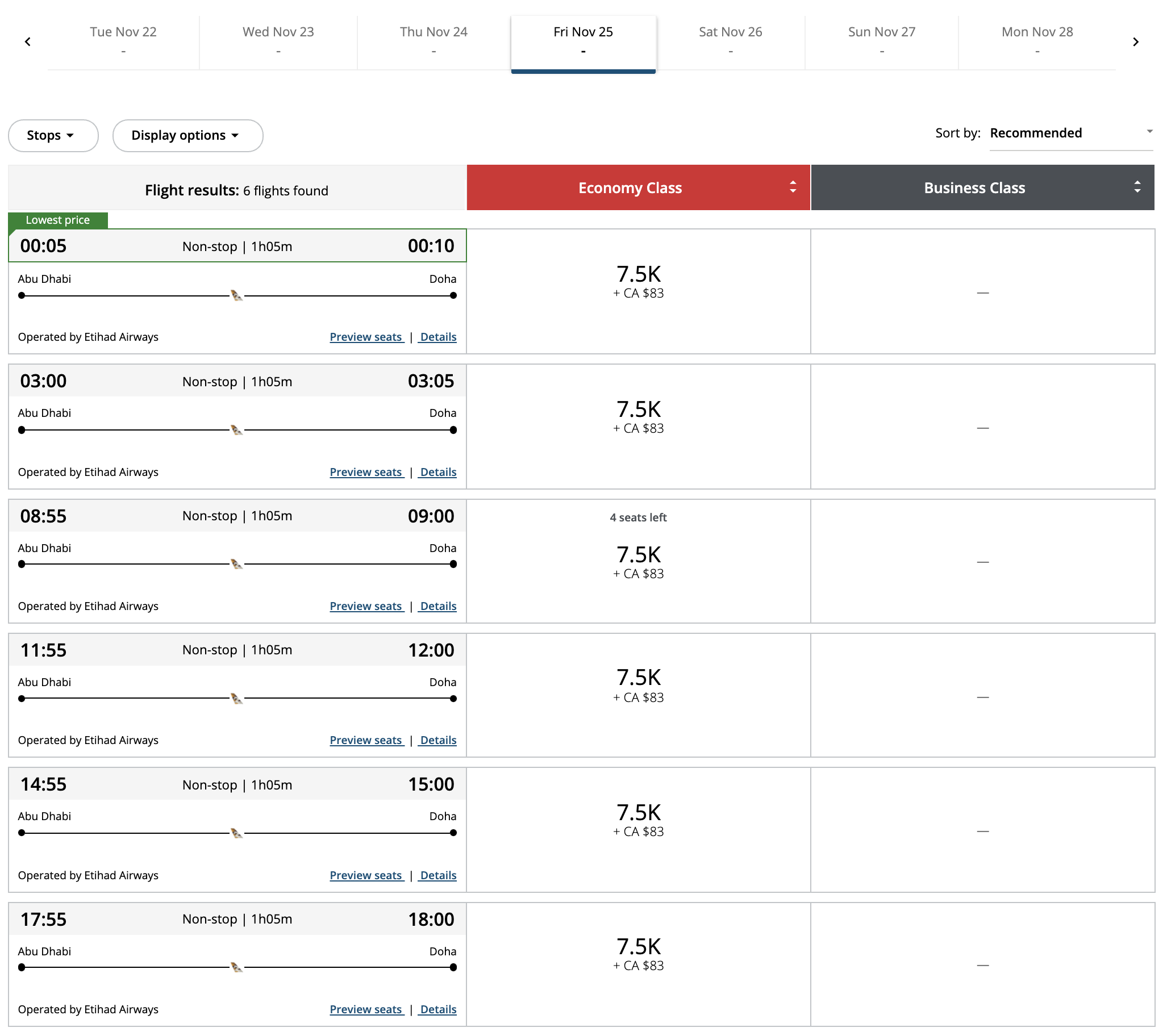 There’s plenty of award space on Etihad’s daily Abu Dhabi–Doha service for only 7,500 Aeroplan points in economy class…
