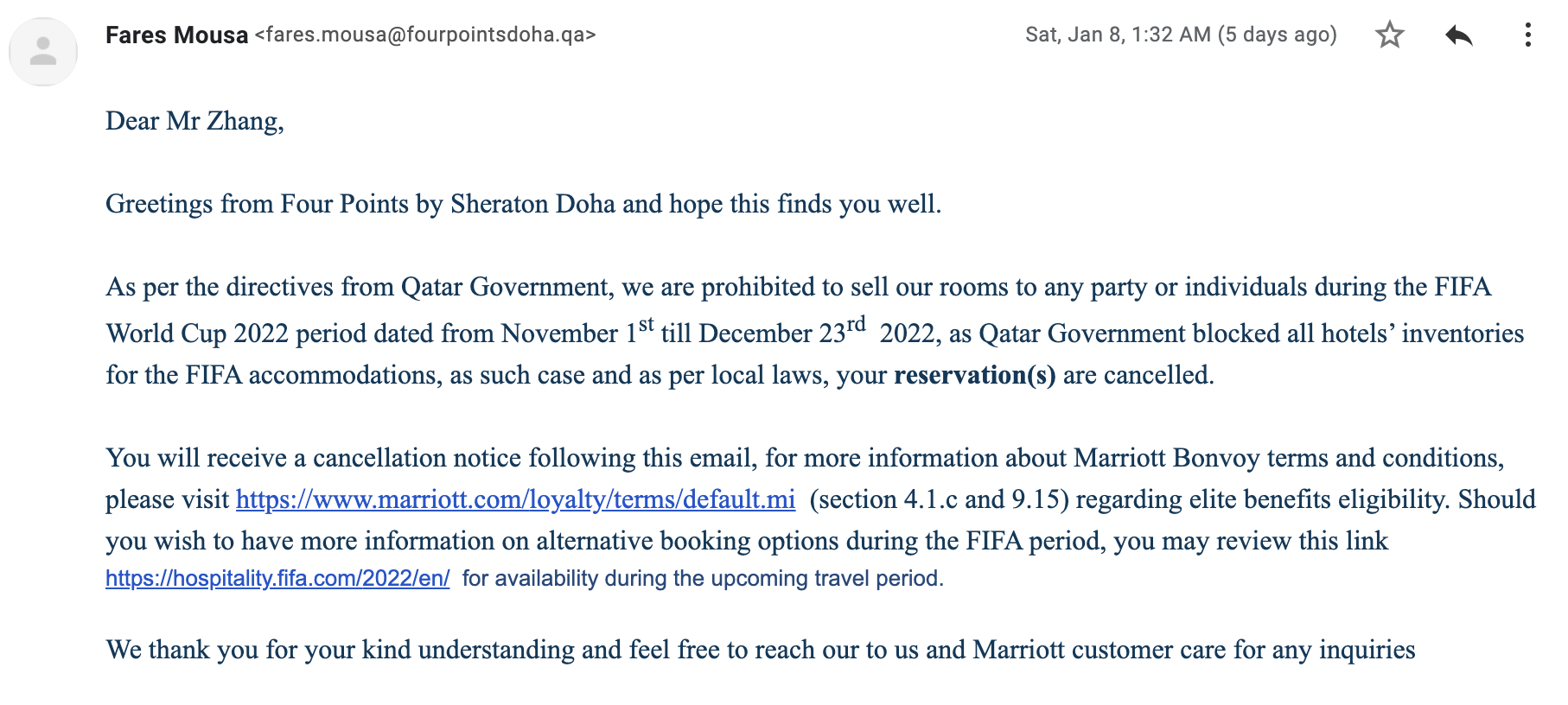 (Indeed, some eagle-eyed Marriott Bonvoy members had been able to redeem points at the Four Points by Sheraton Doha when some award space was briefly available. However, the hotel has since reached out to inform guests that the reservation will not be honoured as per the State of Qatar’s local regulations.)