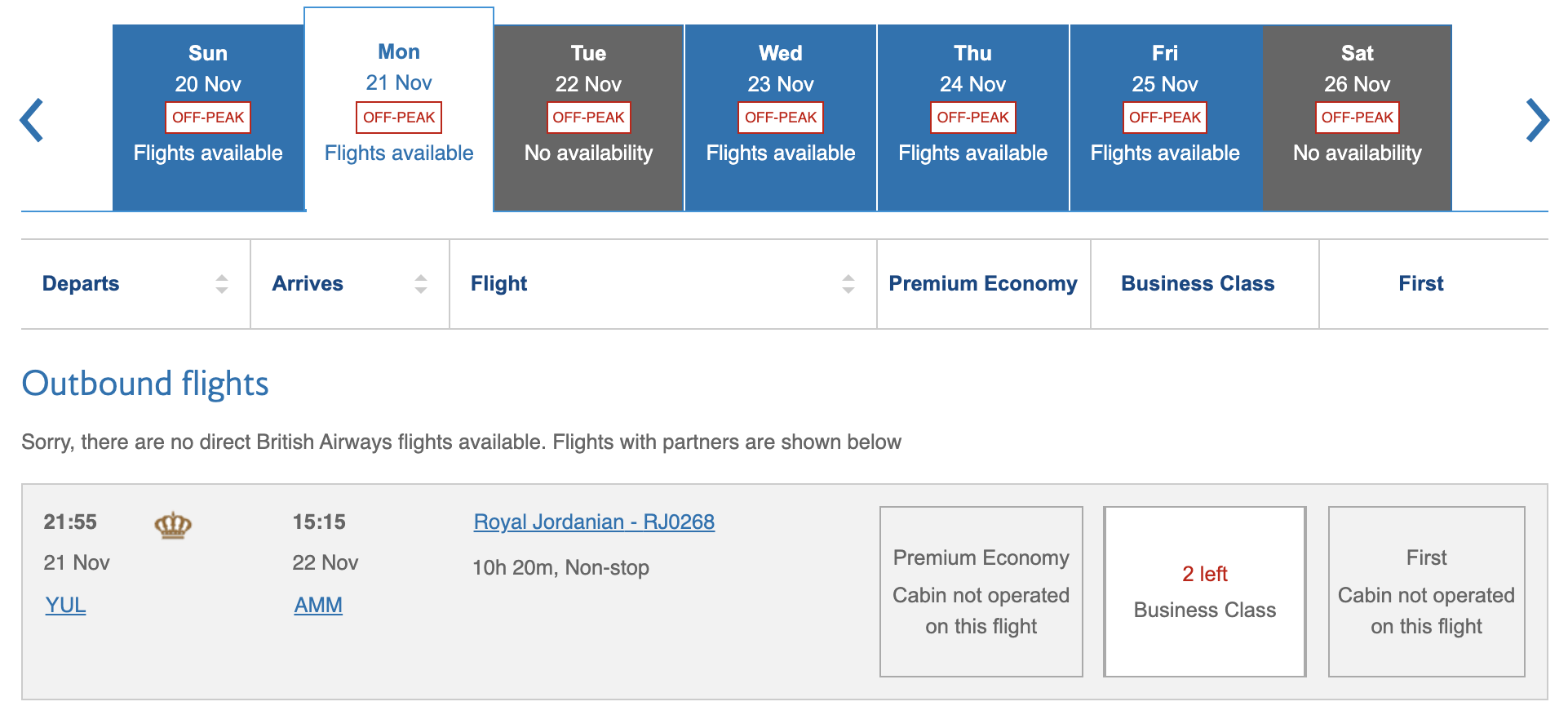 …as well as Royal Jordanian’s Amman–Doha flight for 9,000 Avios in economy or 16,500 Avios in business class.