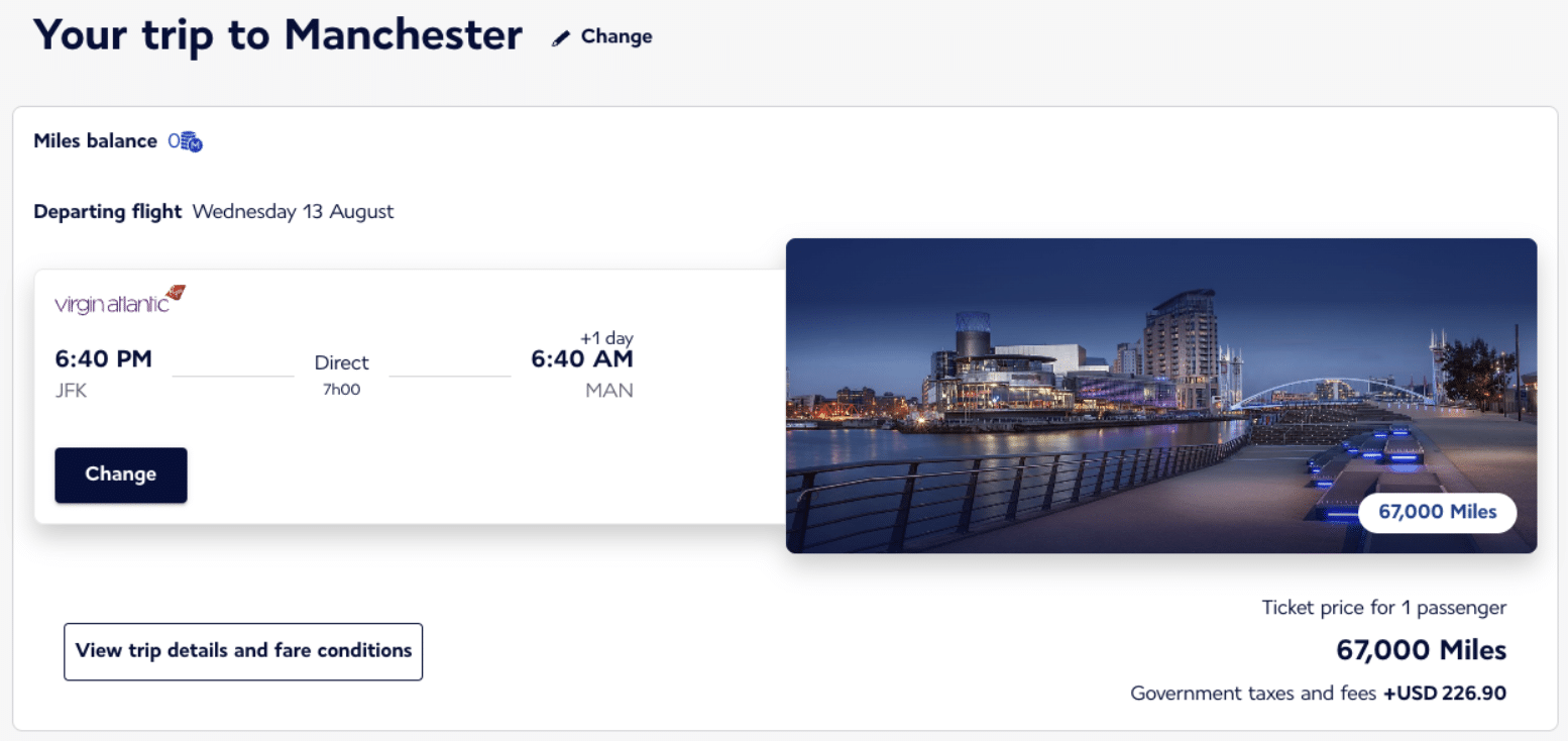 You can typically fly from New York (JFK) to Manchester (MAN) in Virgin Atlantic’s Upper Class for 67,000 Flying Blue miles and $226.90 in taxes and fees.
